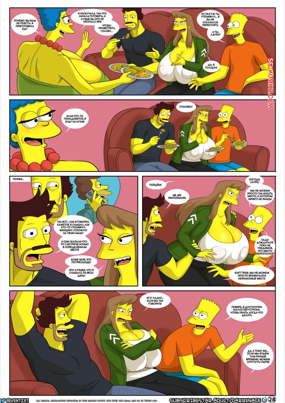 Порно комикс Приключения Даррена. Часть 14. Симпсоны. Darrens Adventure. The Simpsons. Arabatos Лора пришла к Барту и позвала его пообщаться на диване. Тем временем Мардж пошла принять душ и стала ласкать свою пизденку, вспоминая как Даррен ее трахал.