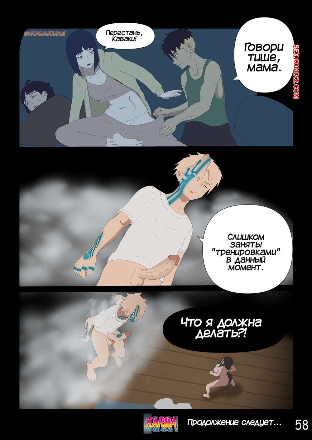 Порно комикс Боруто. Карма и ее тайны. Часть 3. Karma And Its Mysteries Боруто очнулся в больнице и ждет, что его навестит мама, но она никак к нему не идет. Красотка осталась дома одна с Каваки и дала ему выебать свою задницу, после чего сынок заполнил попку мамочки.
