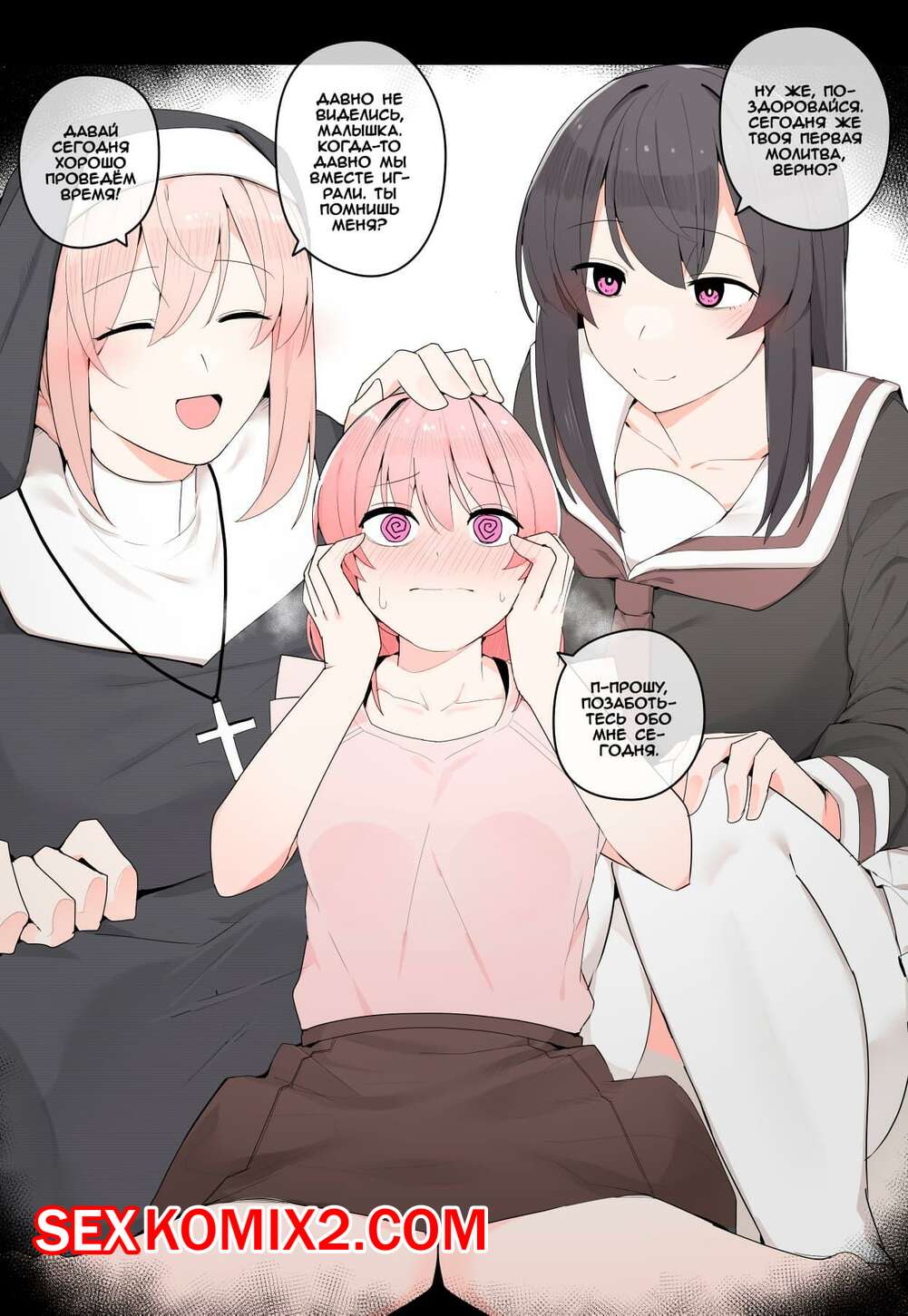 Порно комикс Тройничёк с сёстрами. Shimai to no 3P. Kassai Горячие красотки с большими членами были очень возбуждены и решили повеселиться со своей сестренкой. Они дали ей у себя отсосать, после чего хорошенько ее выебали.