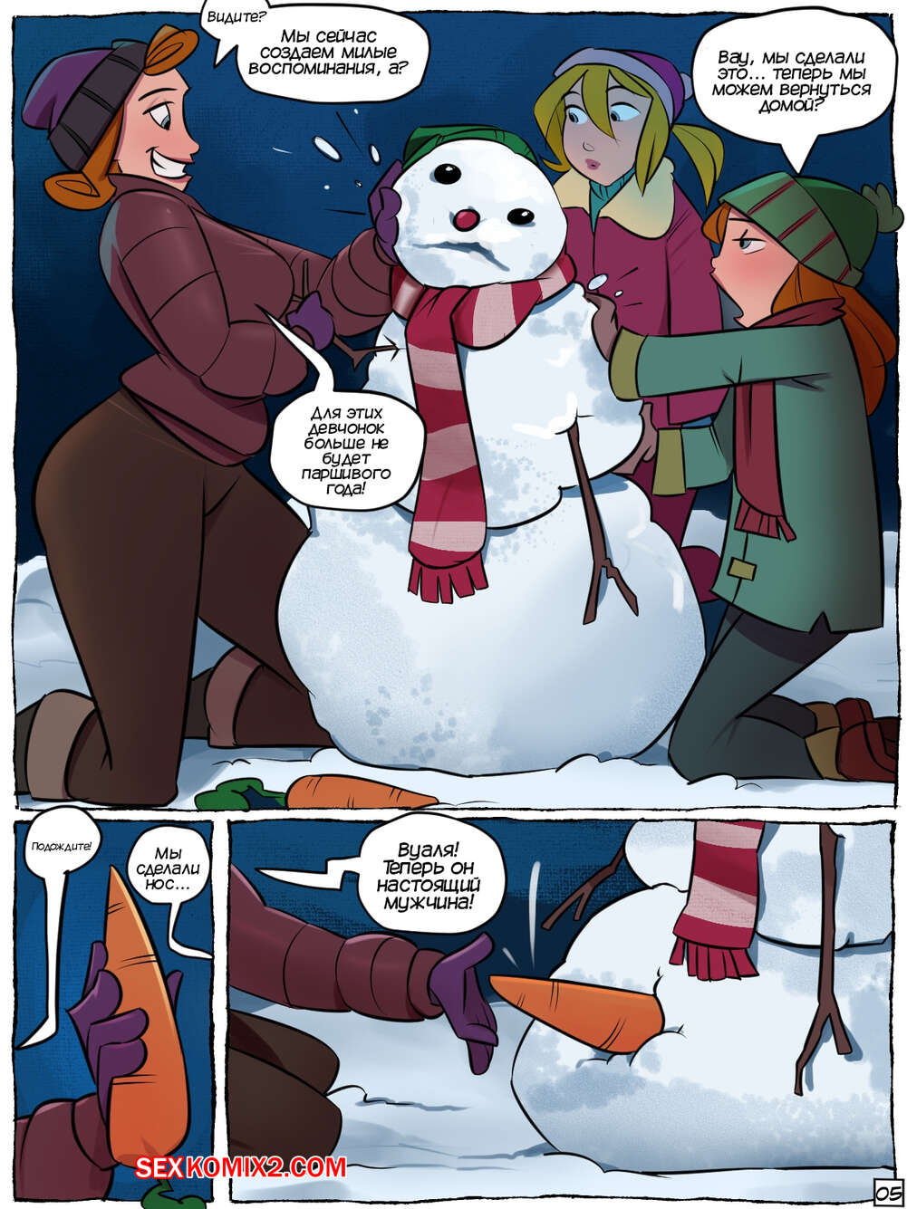 Порно комикс Три желания и снеговик. Three Wishes and a Snowman. Jmoz Горячая блондинка вернулась домой с гулянок, а на улице пошел снег. К девушке и ее младшей сестре в комнату завалилась горячая мамочка, которая повела девушек на улицу лепить снеговика.