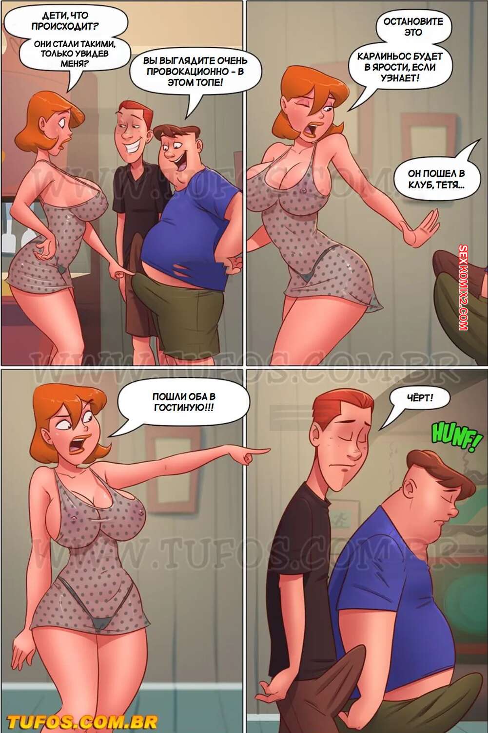Порно комикс Похотливая семейка. Игра. Часть 2. Вариант C. Марафон Озарства. Tufos Два друга Карлиньоса уединились на кухне с его горячей мамочкой. Они стали ласкать большие сиськи милфы, после чего она раздвинула ножки и дала двум юнцам себя выебать.