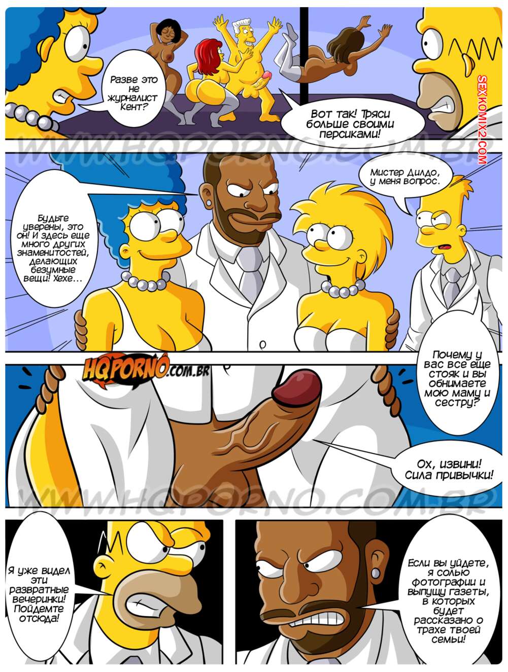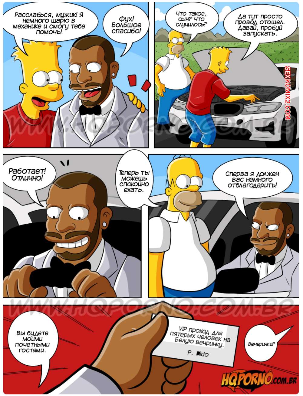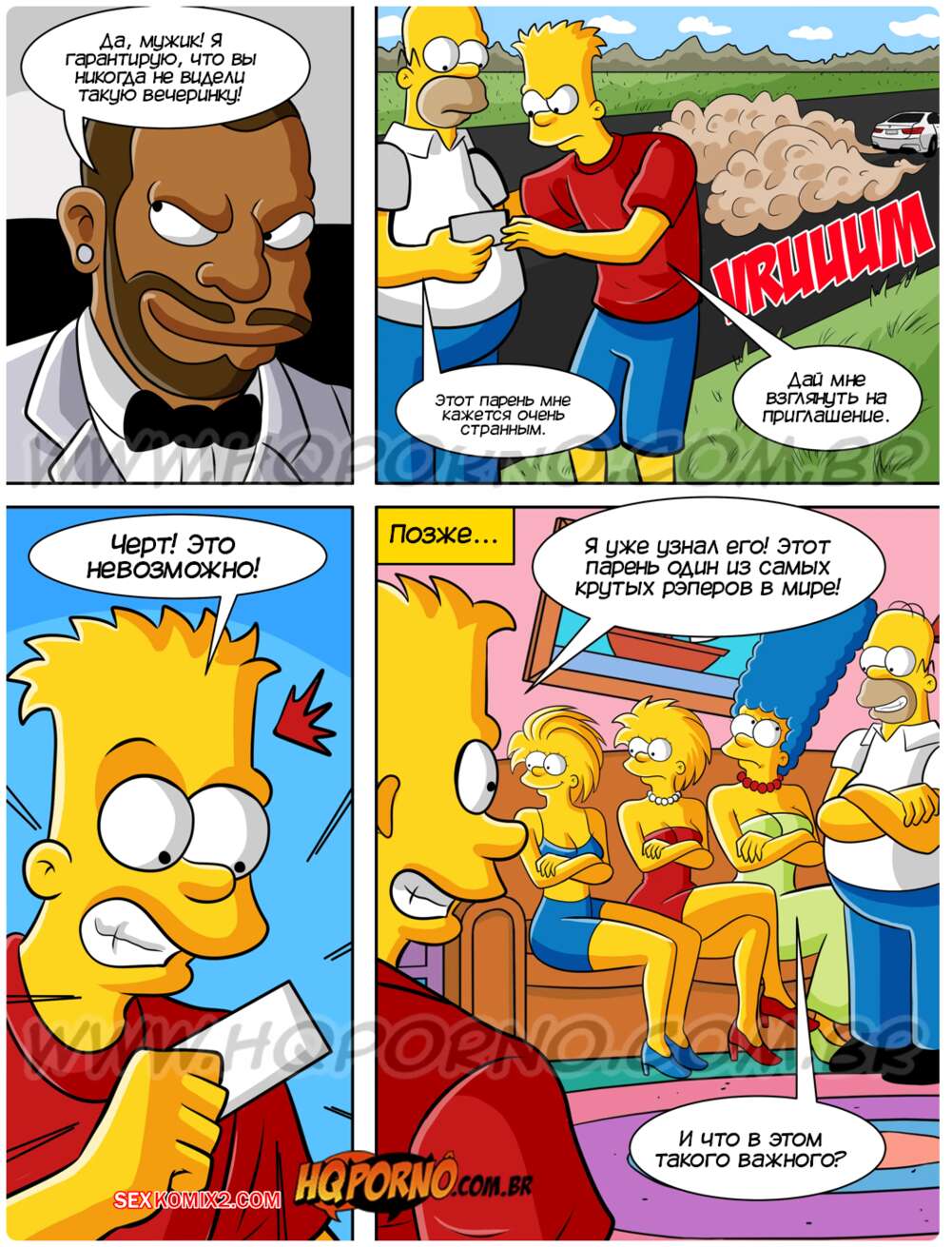 Порно комикс Симпсексы. Часть 21. Os Simpsexys. HQPorno Барт и Гомер помогли темнокожему парню на дороге и он пригласил их на свою Белую вечеринку. Барт быстро понял кто это такой и убедил семью отправиться повеселиться, желая поскорее выебать своих сестер.