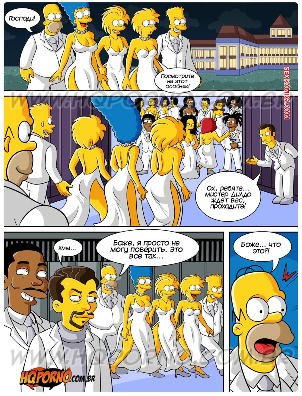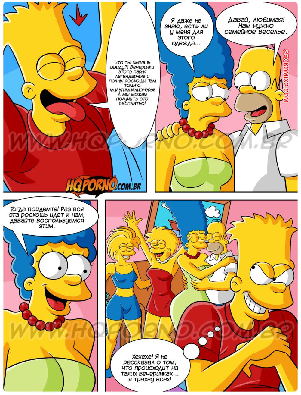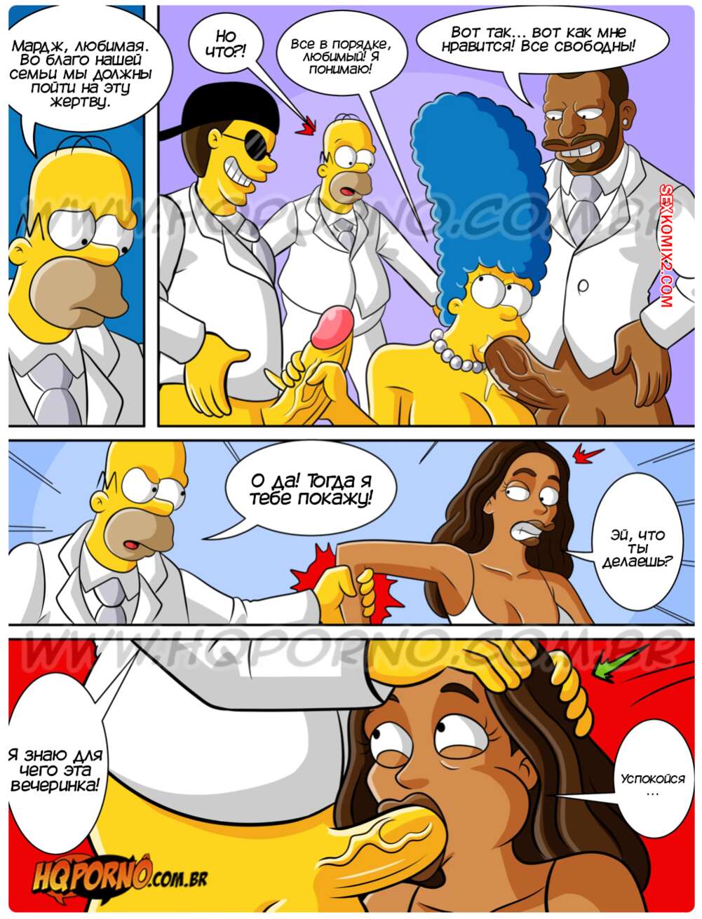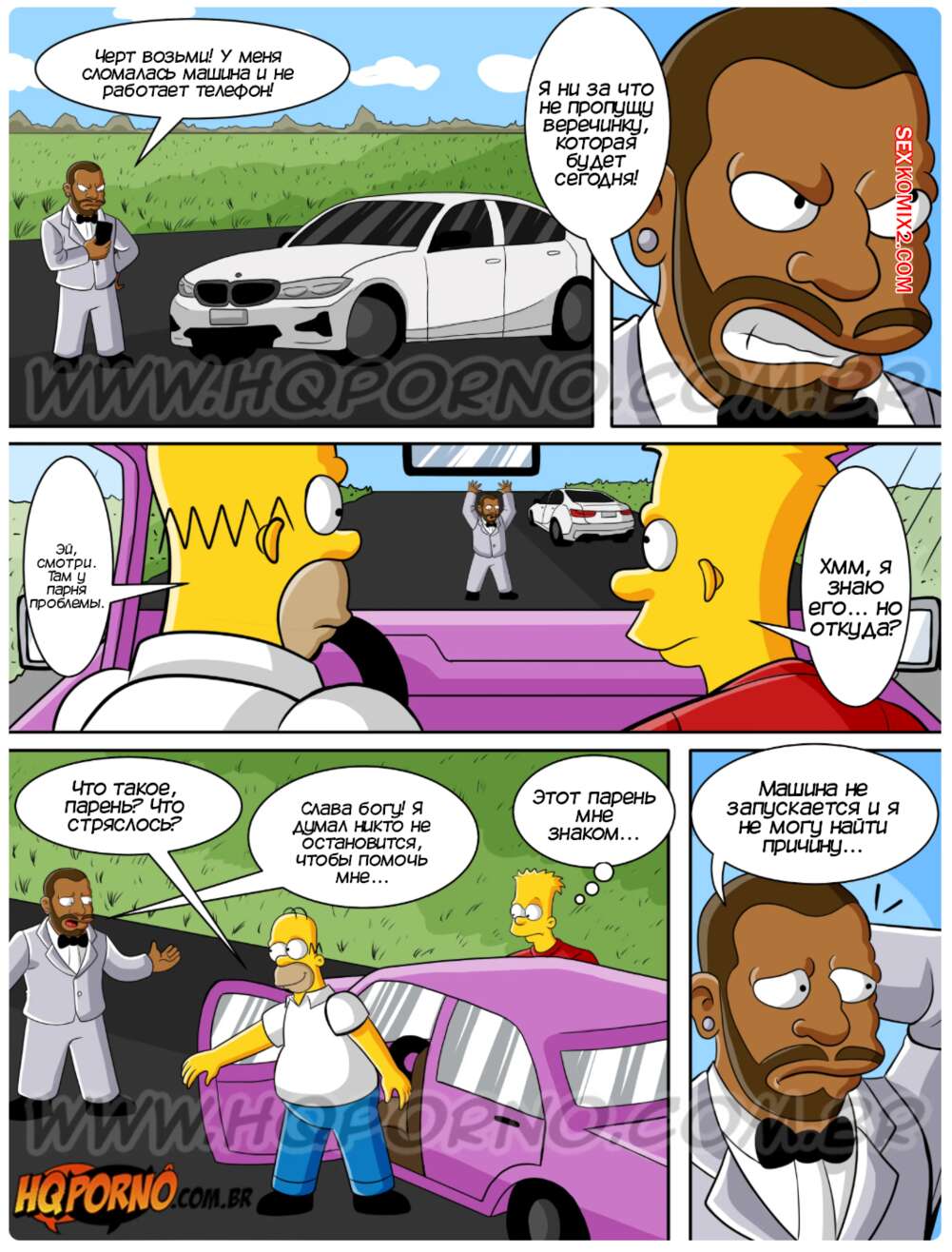 Порно комикс Симпсексы. Часть 21. Os Simpsexys. HQPorno Барт и Гомер помогли темнокожему парню на дороге и он пригласил их на свою Белую вечеринку. Барт быстро понял кто это такой и убедил семью отправиться повеселиться, желая поскорее выебать своих сестер.