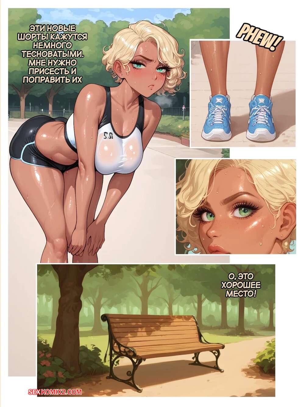 Порно комикс Утрення пробежка закончилась шантажом. Morning run ended with blackmail sex. Spirogi Во время утренней пробежки в парке горячая блондинка решила расслабиться и стала ласкать свою пизденку. Ее за этим делом спалили два парня и шантажом заставили ее трахнуться с ними.