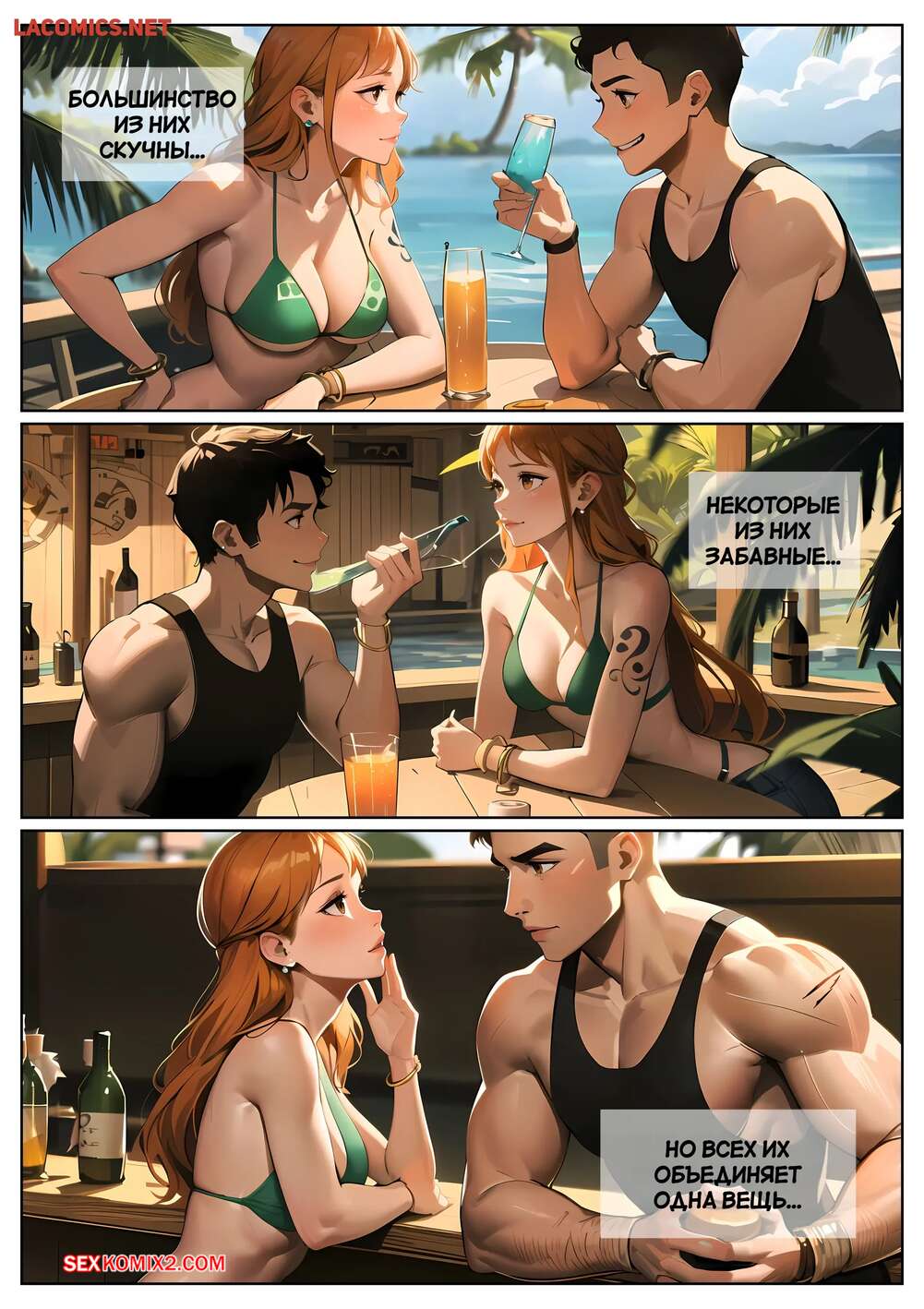 Порно комикс One Piece. Нами. Nami Panels. Kate Sketches. Рыжая красотка Нами познакомилась на пляже с симпатичными парнями и решила с ними повеселиться. Красотка встала на колени и отсосала хуи парней, после чего дала им себя выебать.
