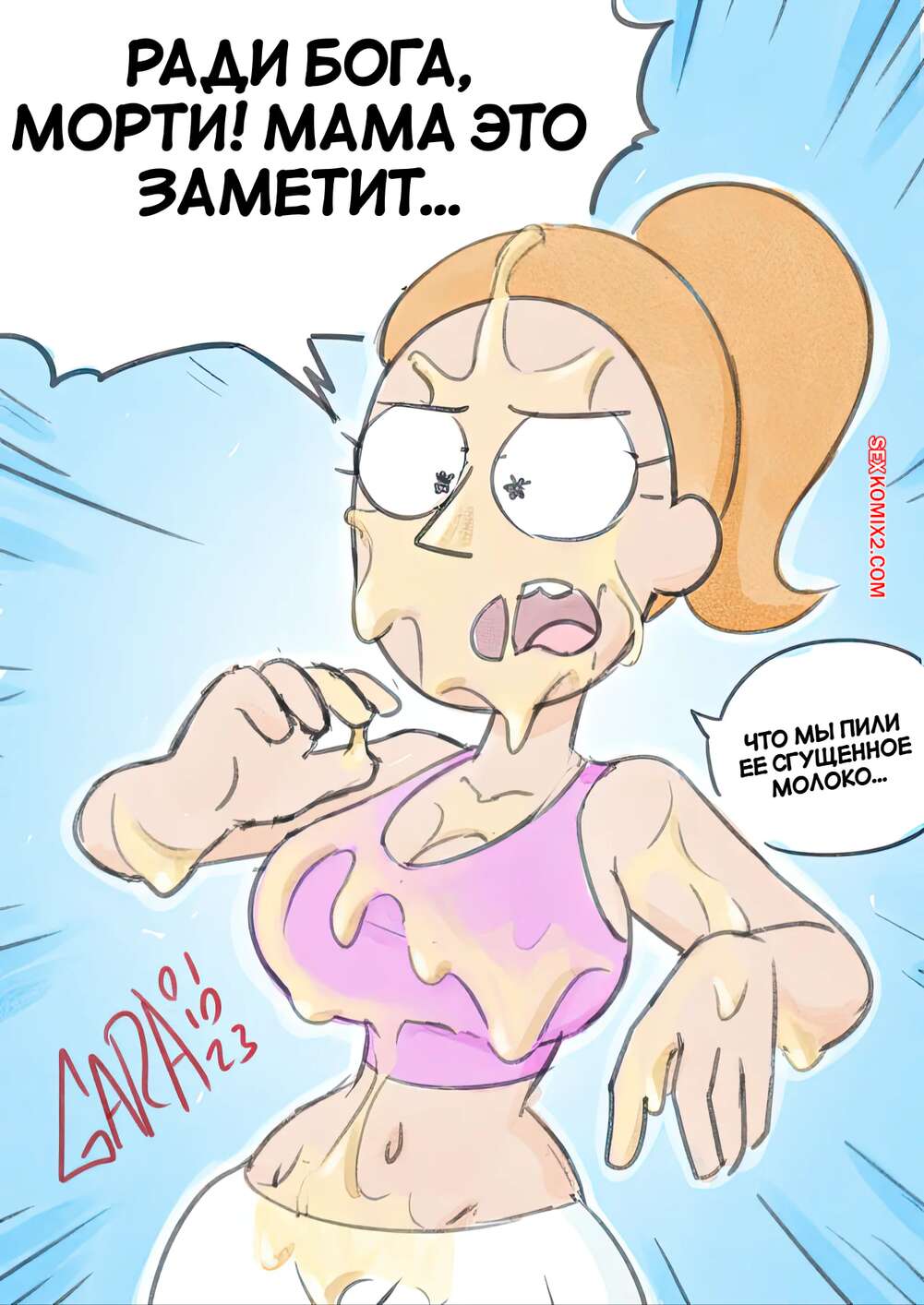 Порно комикс Рик и Морти. Саммер и Морти. Summer x Morty. Garabatoz. У горячей красотки Саммер увеличились сиськи и Морти не может пройти мимо сестренки. Он стягивает с нее трусики и трахает ее пизденку, после чего заполняет рыжую девушку спермой.