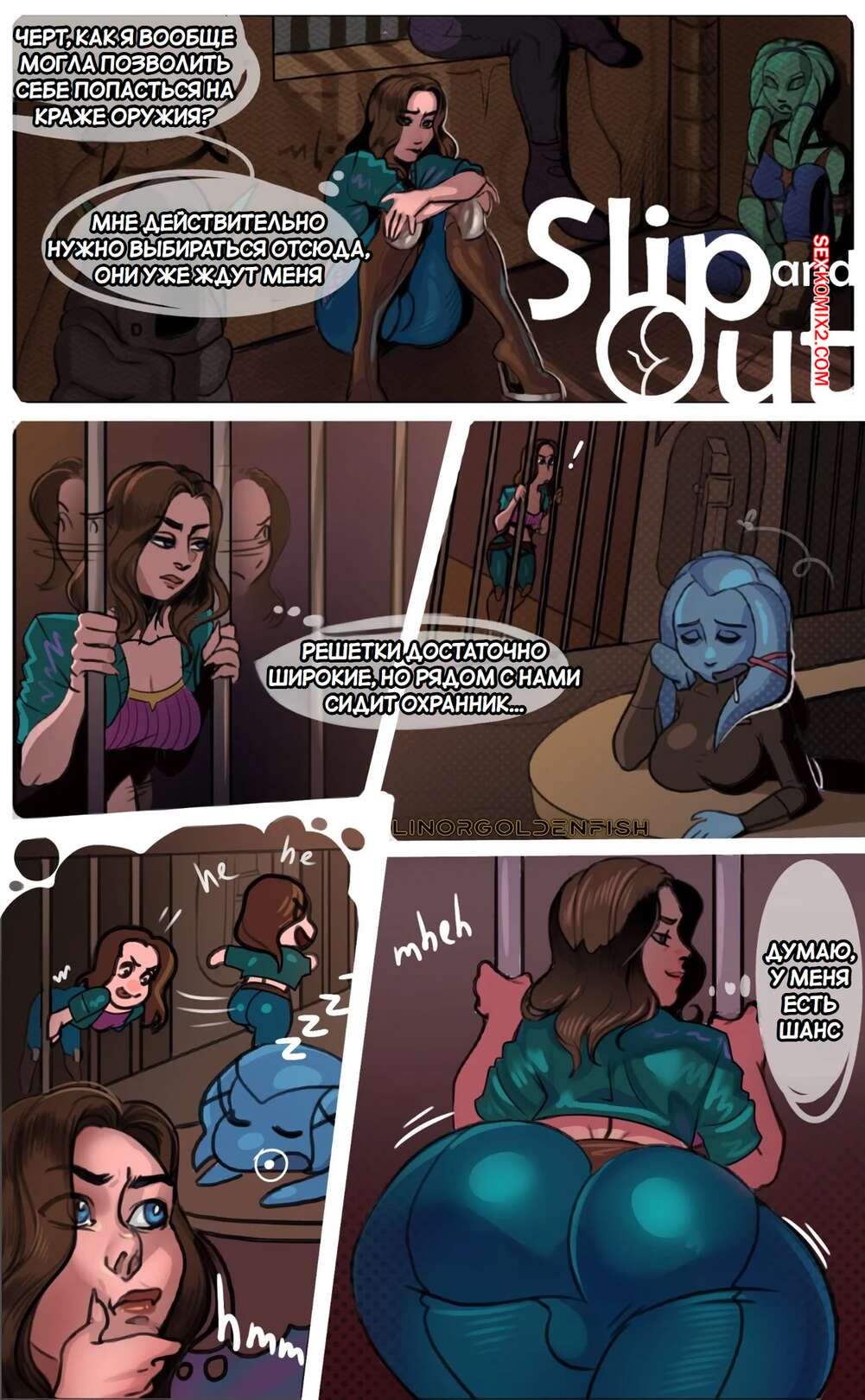 Порно комикс Проскользнуть и уйти. Slip and Out. Linor Goldenfish Горячая брюнетка попала за решетку, но ей нужно убраться оттуда. Девушка постаралась пролезть между прутьев, но застряла. Ее сокамерницы решили воспользоваться моментом и стали трахать девушку.