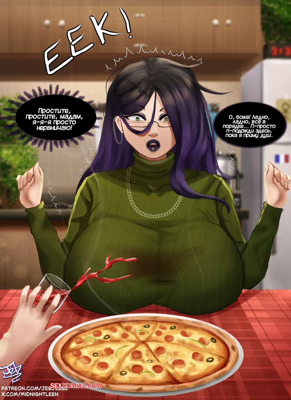 Порно комикс Случайное ночное свидание. Accidental Date Night. MayleenMidnight, Jebjebbz. Сексуальная милфа заказала вечером пиццу, чтобы осуществить свой план по соблазнению курьера. Парень сперва стеснялся, но красотка соблазнила его своим шикарным телом, чтобы он ее хорошенько выебал.