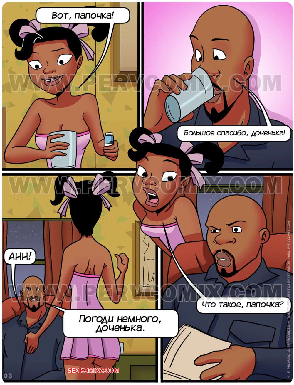 Порно комикс Крис всех заводит. Часть 1. Todo mundo excita o Chris. PervComix Темнокожий мужик вернулся домой с работы и у него болела голова. Дочь решил помочь папочке и принесла ему лекарства, но по ошибке дала ему виагру. У бати встал хуй, поэтому девушке пришлось помочь ему избавиться от стояка.