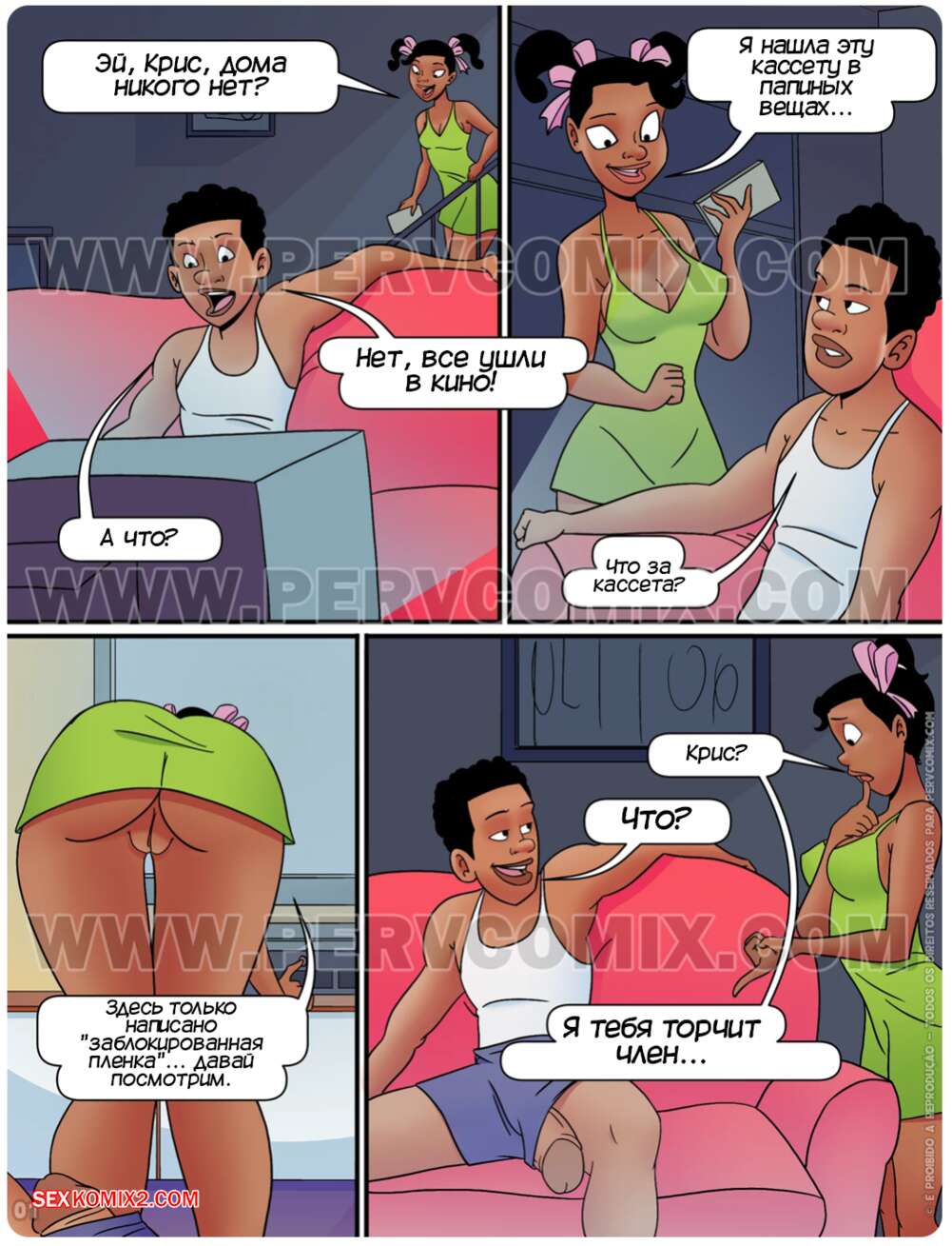 Порно комикс Крис всех заводит. Часть 4. Todo mundo excita o Chris. PervComix Крис и Тоня остались дома одни, пока их родители отправились в кино. Девушка нашла порно кассету, от чего они с братом возбудились и решили пошалить. Красотка позволила Крису выебать себя в киску и попку, от чего они вместе кончили.