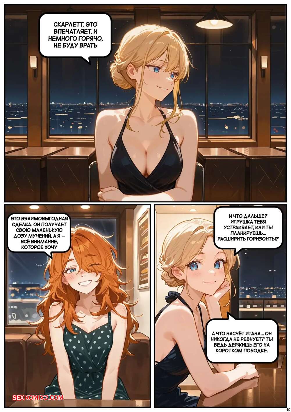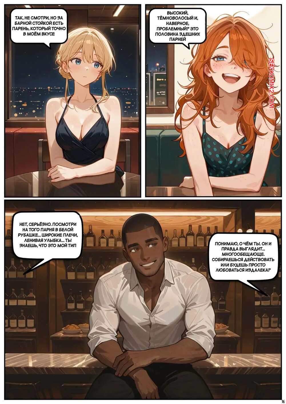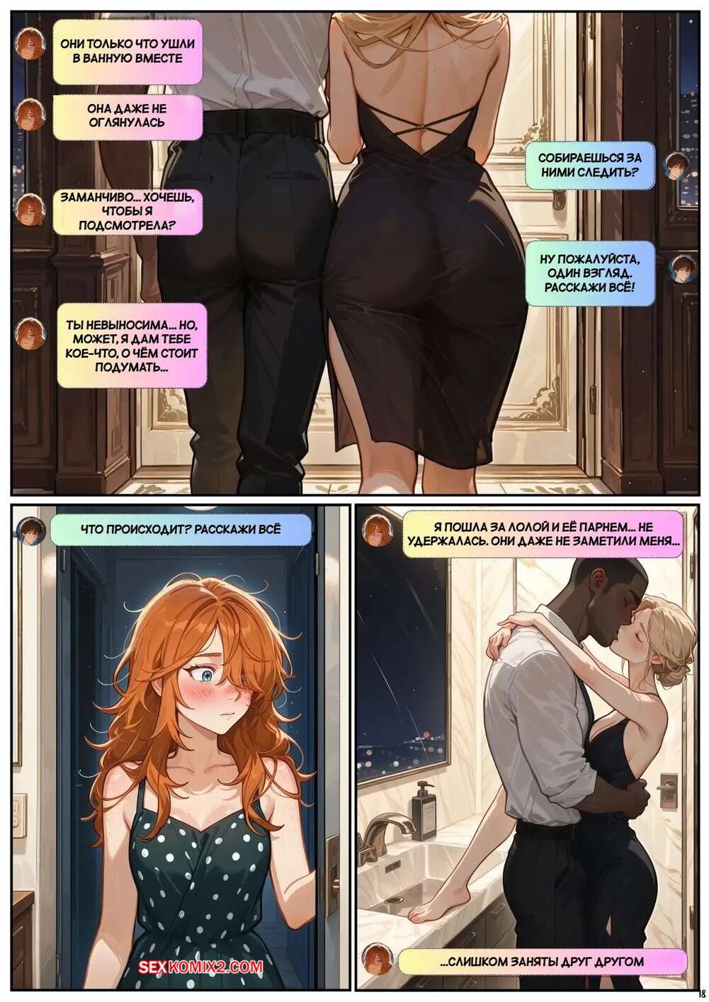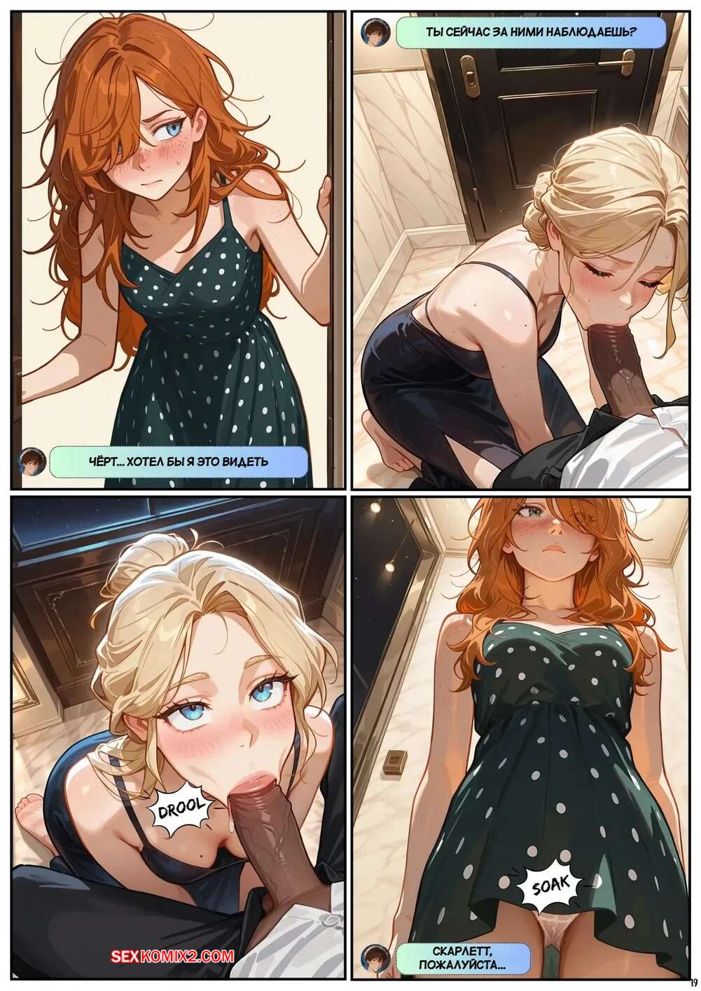 Порно комикс Скарлет Блейз. Часть 8. Между наблюдением и желанием Две подруги отправились вечером в ресторан, где блондиночка сразу положила глаз на симпатичного темнокожего парня. Они отправились в туалет, где красотка отсосала хуец нового знакомого и дала ему себя выебать.