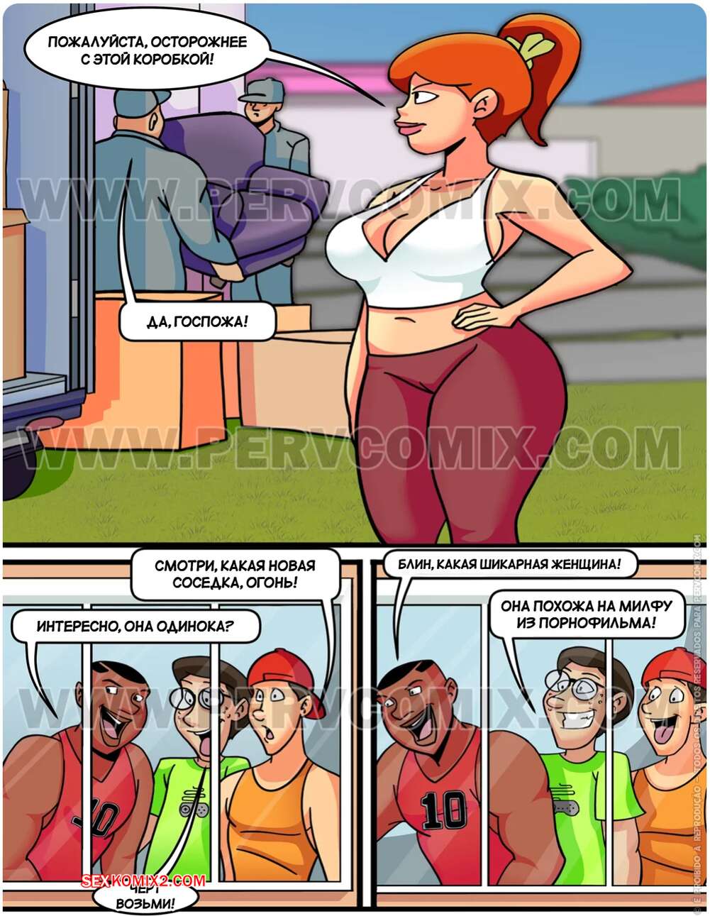 Порно комикс Эдна. Соседская старая дева. Часть 1. Edna. A solteirona do bairro. PervComix. Рыжая милфа переехала в новый район, не успела она еще разобрать свои коробки, как ее подметили местные молодые парни, они пришли ей помочь с переездом. И приняли благодарность в виде секса.