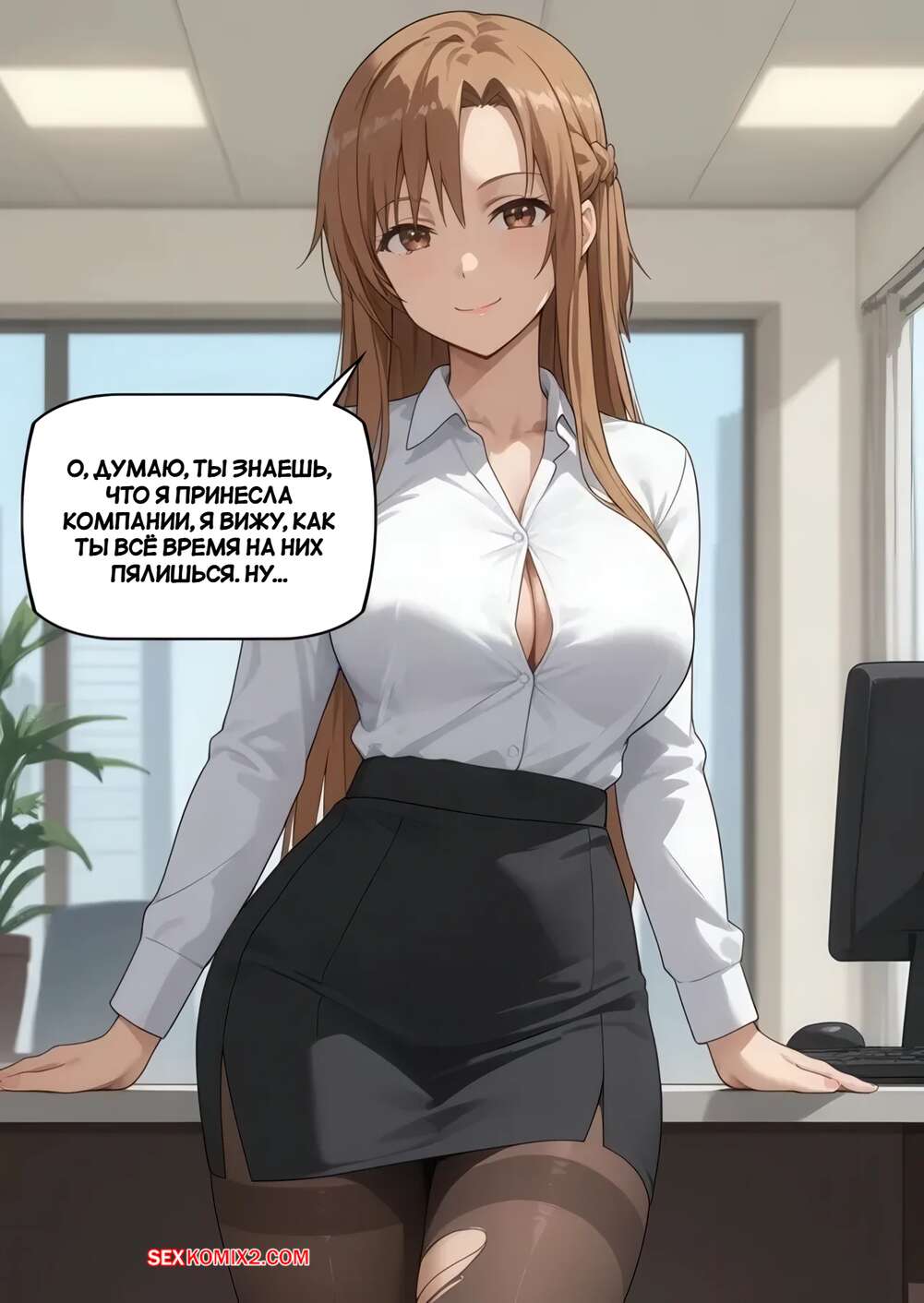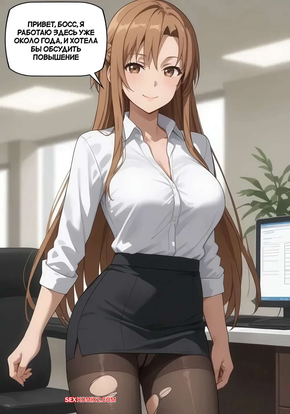 Порно комикс Асуна ваш секретарь и хочет повышения зарплаты Горячая брюнетка в короткой юбочке отправилась в кабинет к своему боссу, чтобы получить повышение зарплаты. Красотка встала на колени и отсосала хуй парня, после чего дала ему выебать свою пизденку и кончить в нее.