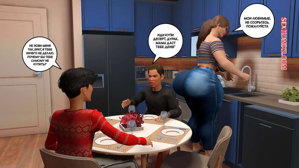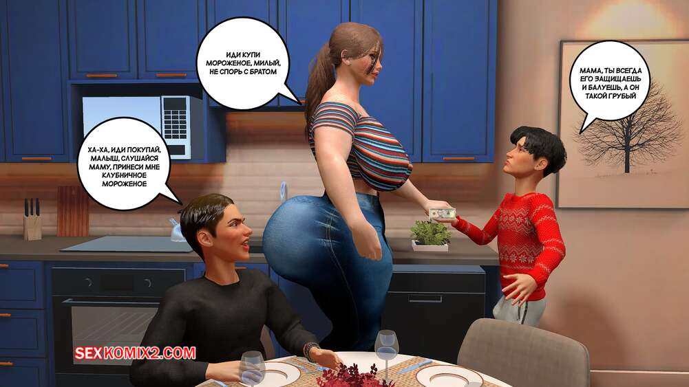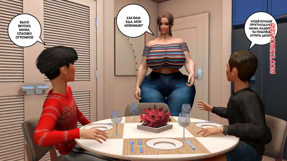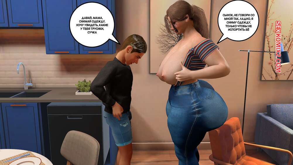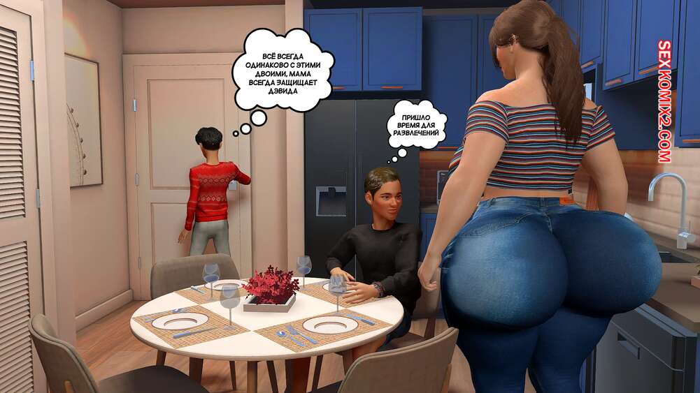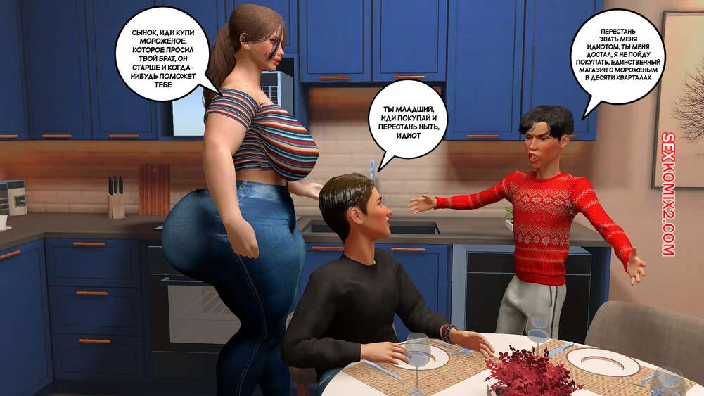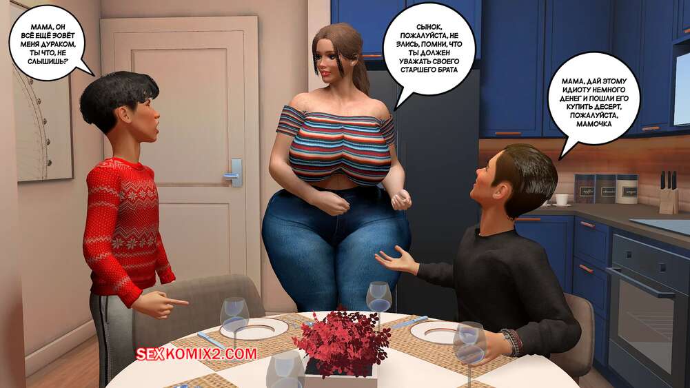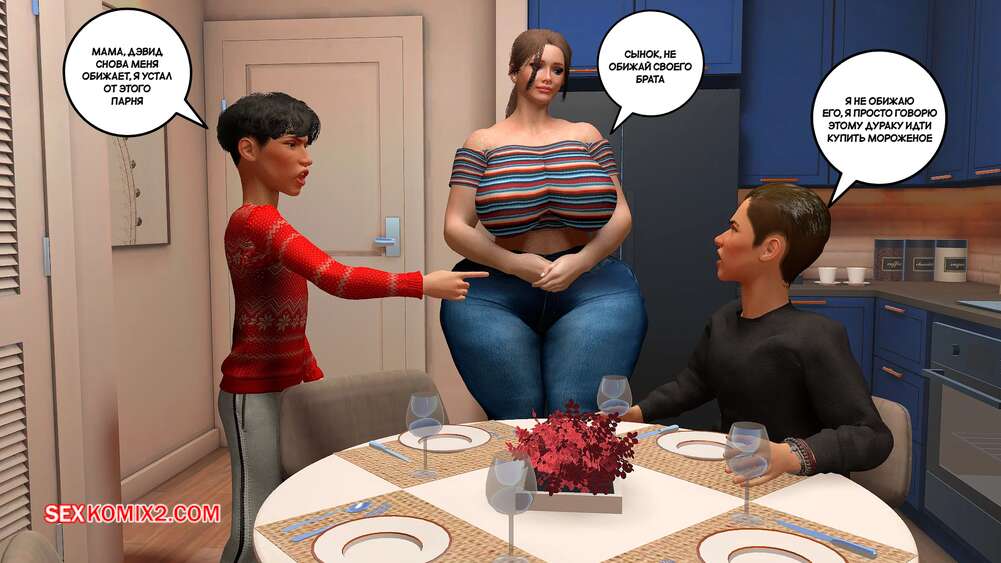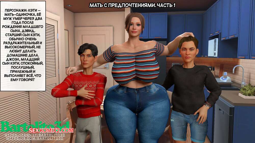 Порно комикс Предпочтения матери. Часть 1. Preferencias de una madre. Bartolito3d Горячая милфа с шикарным телом в одиночку воспитывает двух сыновей. После завтрака один из них посепшил в свою комнату, а второй парень остался с мамочкой и стал ласкать ее сиськи, после чего она раздвинула ножки и дала себя трахнуть.