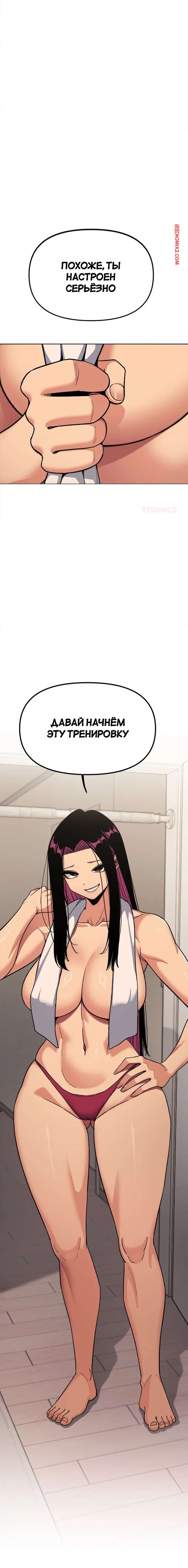 Порно комикс Хватит курить. Часть 61. Someone Stop He Сексуальная брюнетка предлагает парню начать тренировку и отправляет его на турник. Парень подтягивается перед девушкой в одних трусиках и полотенцем на сиськах, от чего у него, естественно, встает хуй.