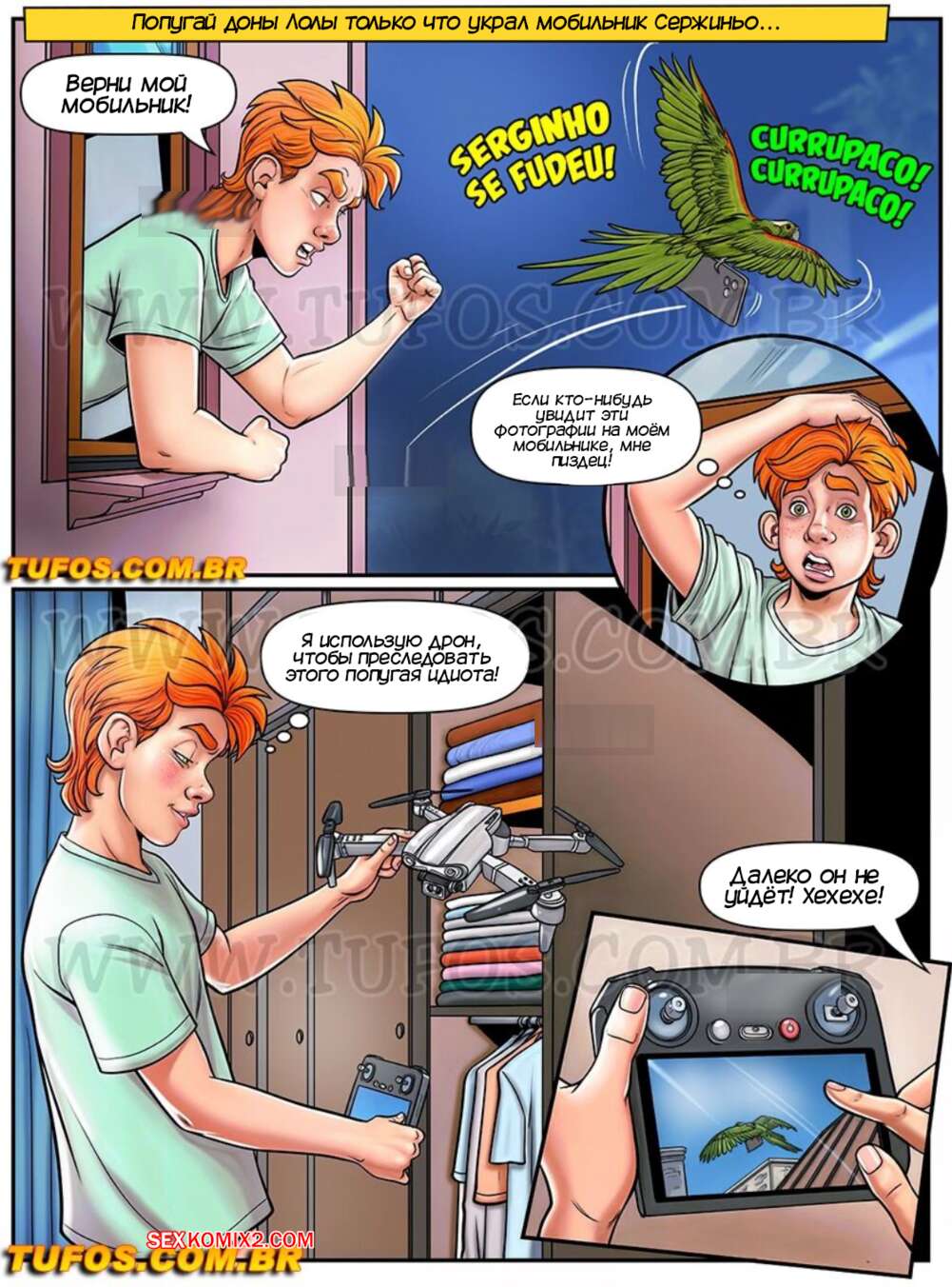 Порно комикс Донья Мама. Часть 12. Dona Mama a maezona da galera. Tufos В руки Доны Мамы попал телефон Сержиньо с ее голыми фото. Она пошла в комнату к сыну, чтобы разобраться в ситуации. Милфа отсосала член сына и дала ему себя трахнуть, после чего удалила с телефона все голые фото.