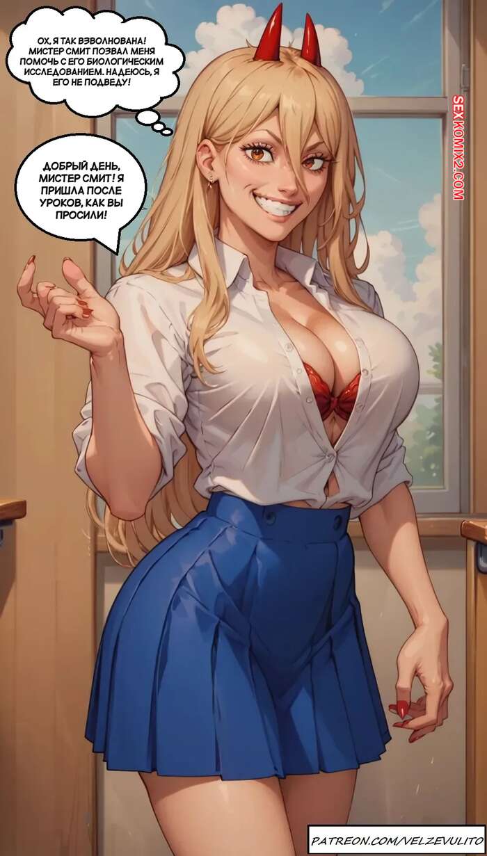 Порно комикс Chainsaw Man. Приключения Пауэр в школе. Powers School Adventures Velzevulito. Горячая блондинка пришла в школу, где осталась наедине со своим темнокожим дружком в классе. Девчуля встала на колени и отсосала огромный хуй парня, помогая ему кончить.