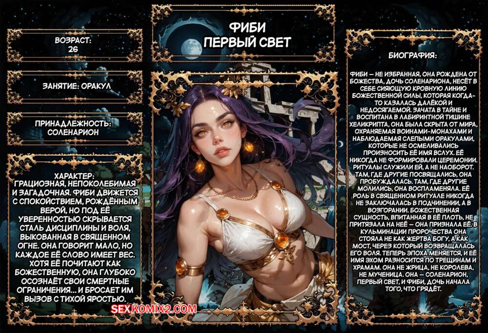 Порно комикс Фиби. Первый свет. Phoebe Character. TheNoMadGuy. Сексуальная правительница возбуждена и хочет секса. Она раздевается и ласкает свою пизденку, после чего приглашаение к себе своего подчиненного. Он насаживает девушку на свой член и хорошенько ее трахает, доставляя ей оргазм.