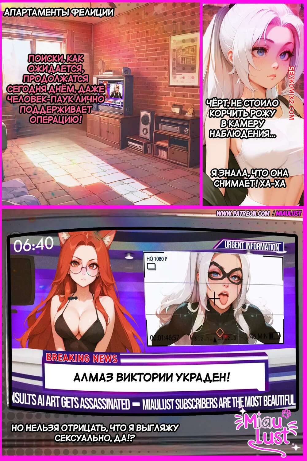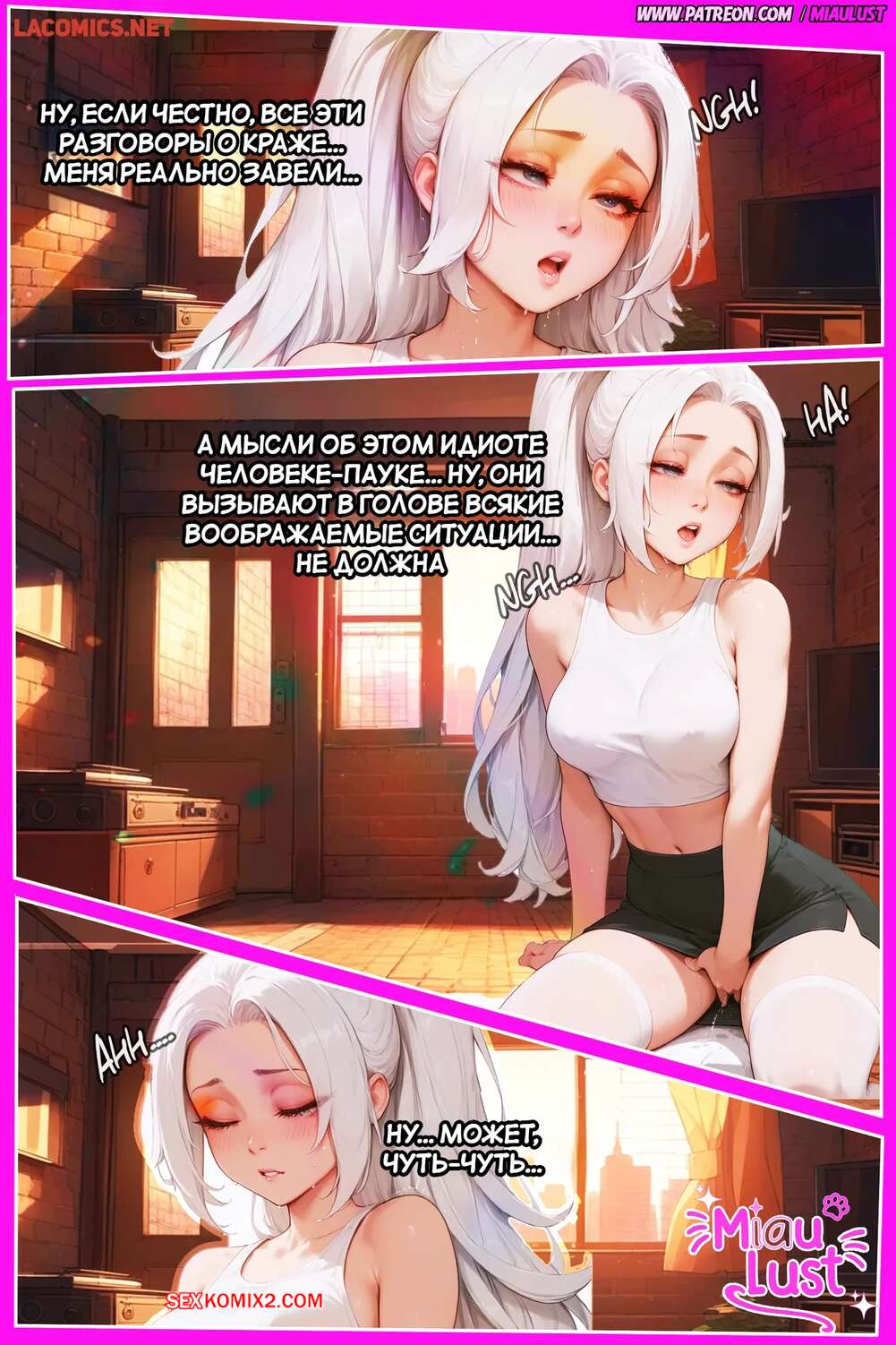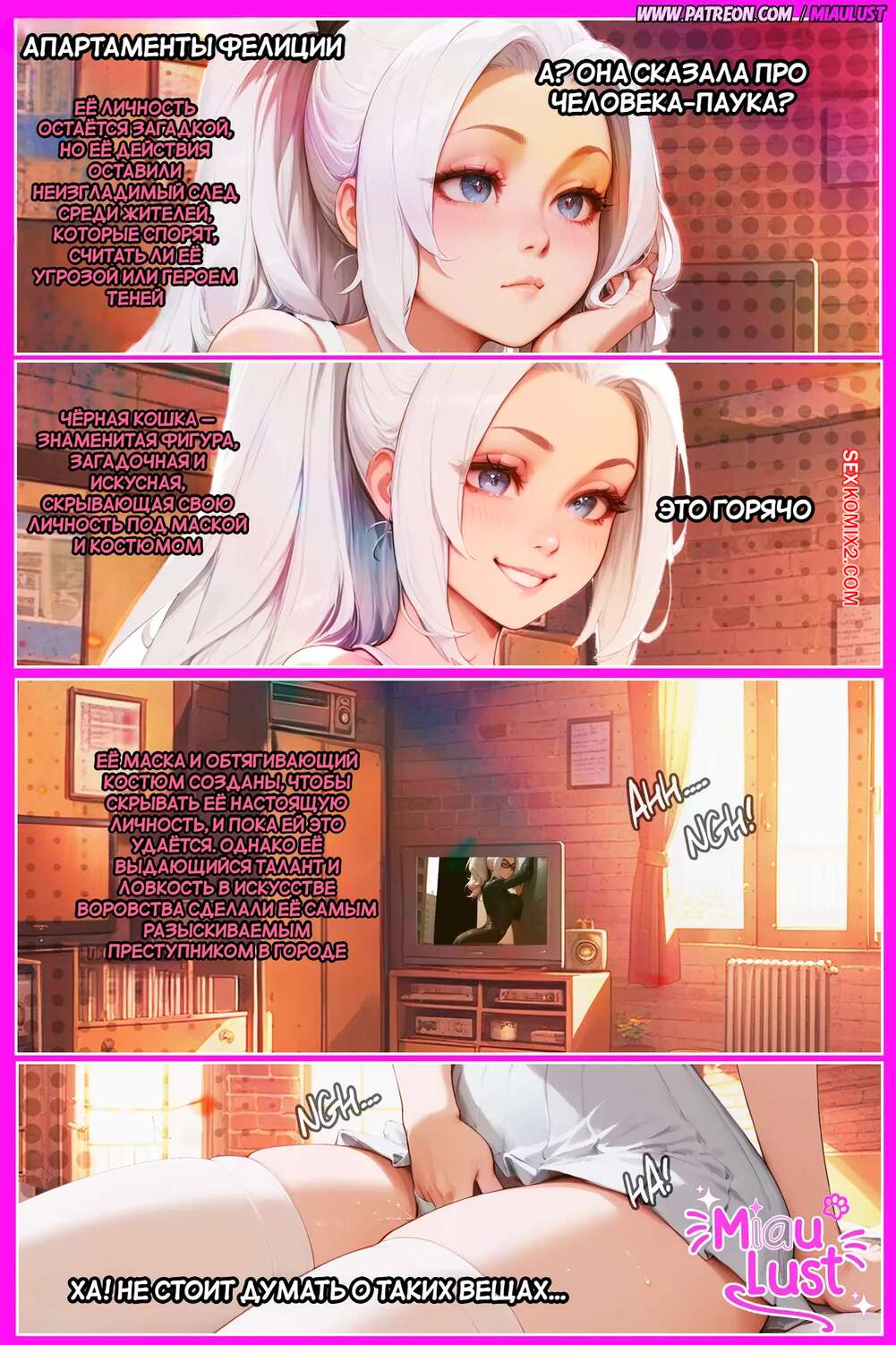 Порно комикс Marvel. Черная кошка. BlackCat PinkPages. MiauLust Красотка Фелиция очень возбуждена и хочет секса. Она раздевается и представляет секс с Человеком пауком, одновременно с этим лаская пальчиками свою пизденку и получая удовольствие.