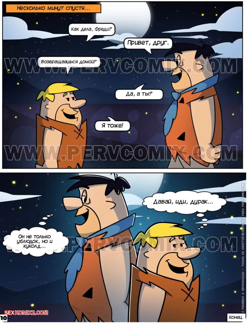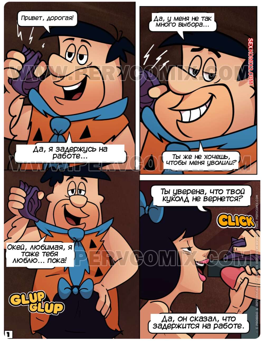 Порно комикс Флинстоуны. Часть 6. Os Pervstones. PervComix Два друга звонят своим женам и сообщают, что они задержатся. На самом деле они уединяются с женами друг друга, чтобы трахнуть их своими большими хуями, заполняя спермой.