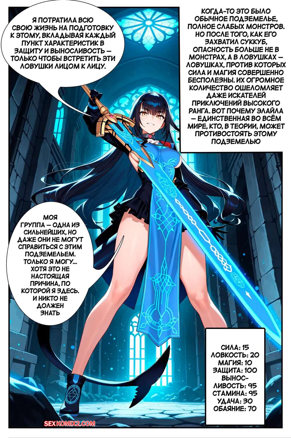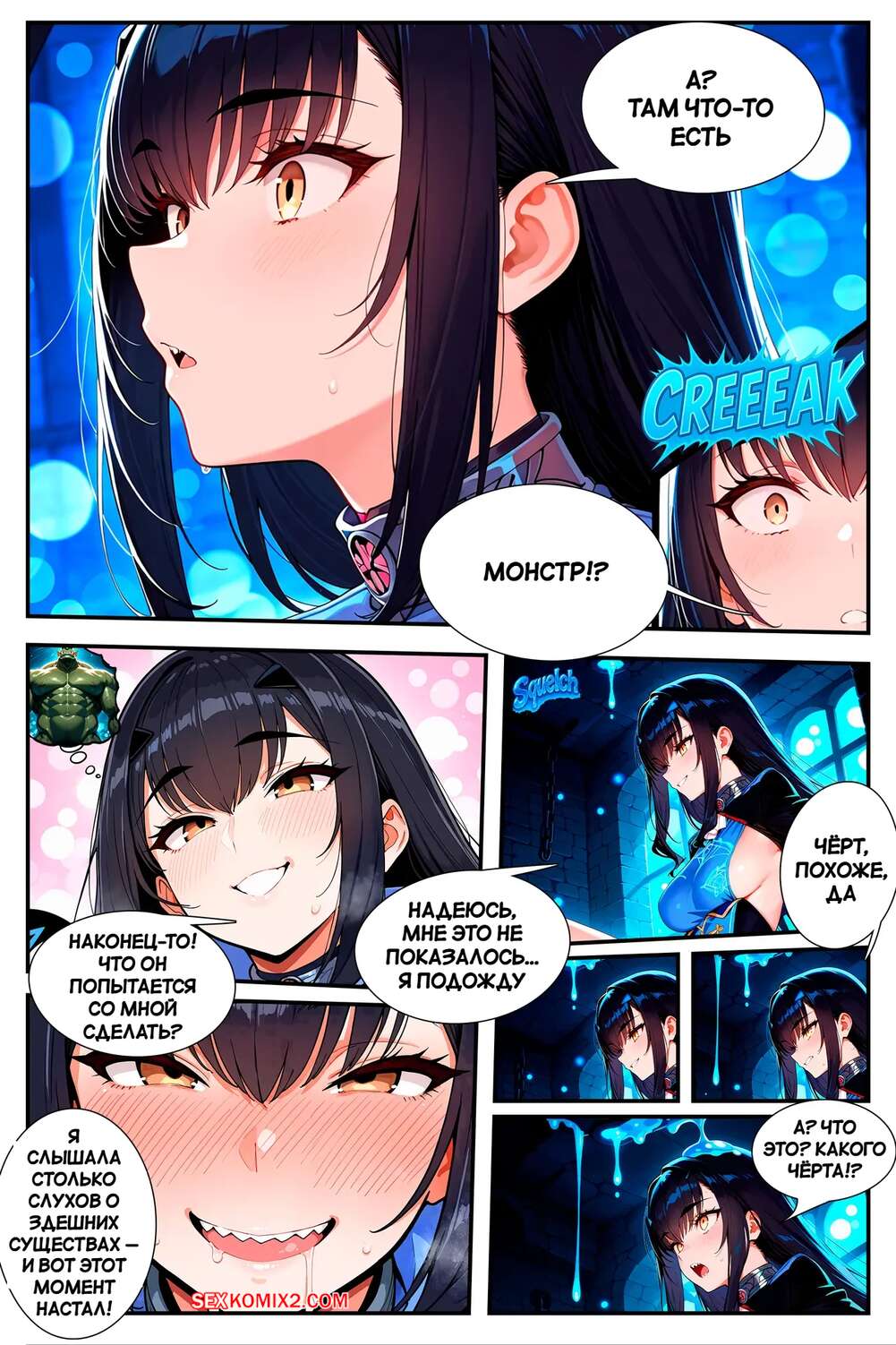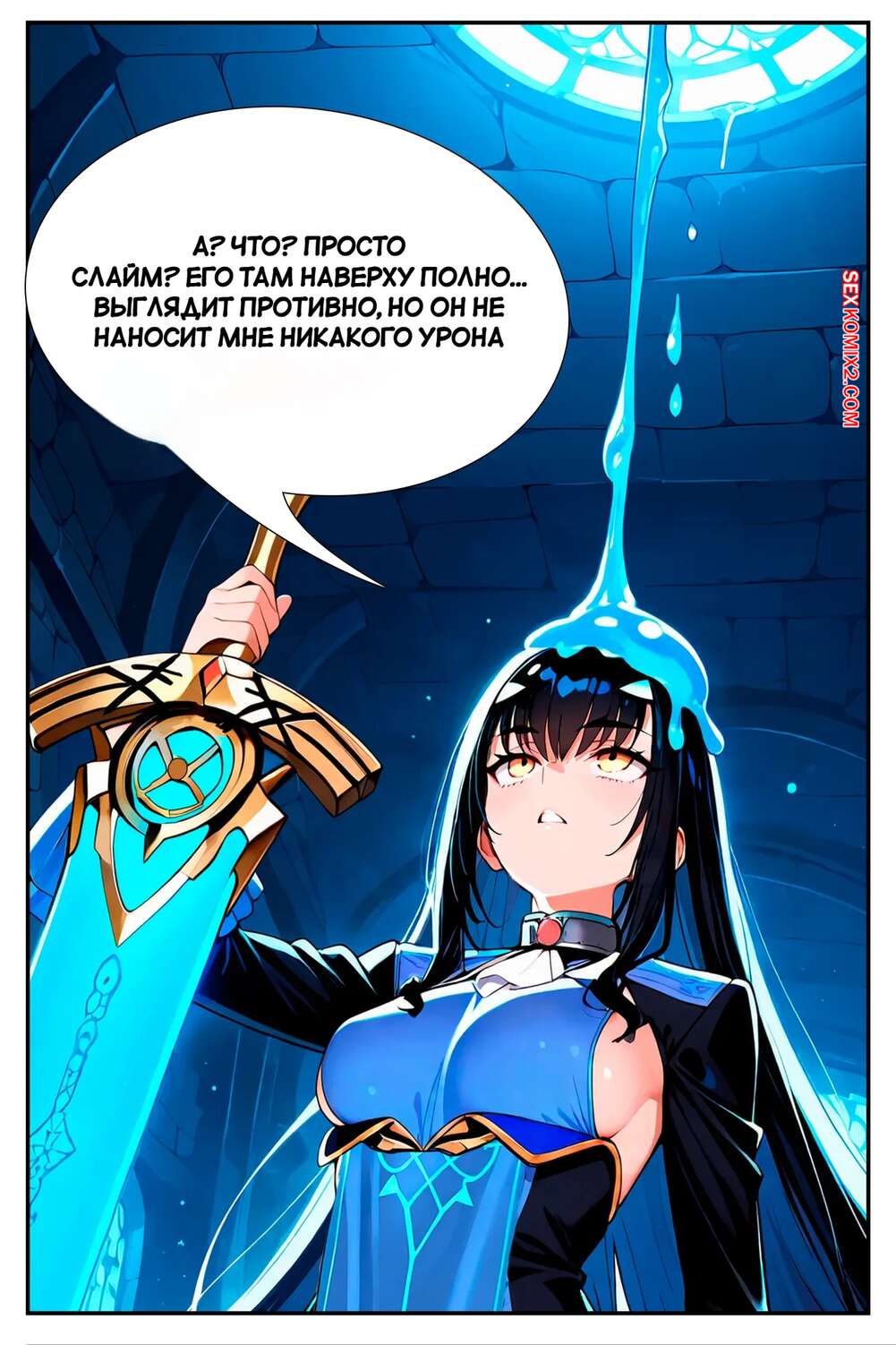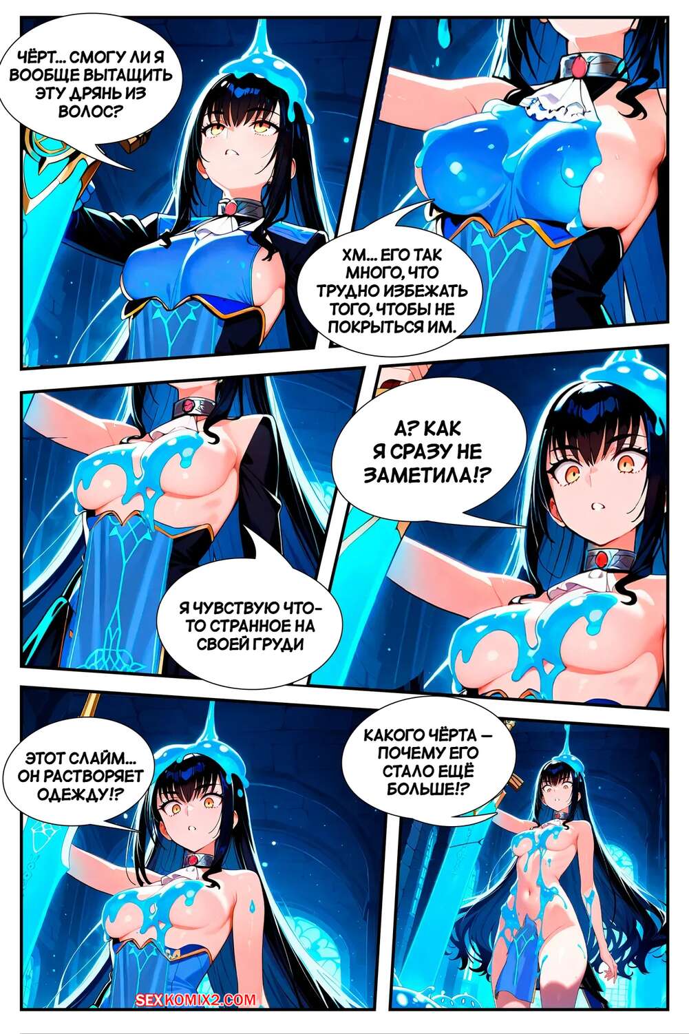 Порно комикс Покоритель ловушек подземелий. Часть 1. Dungeon trap conqueror. Sirnrei. Брюнетка завоевательница отправилась в подземелье, где на нее сверху стало чтото капать. Девушка оказалась охвачера голубой слизнью, которая стала ласкать ее пизденку.