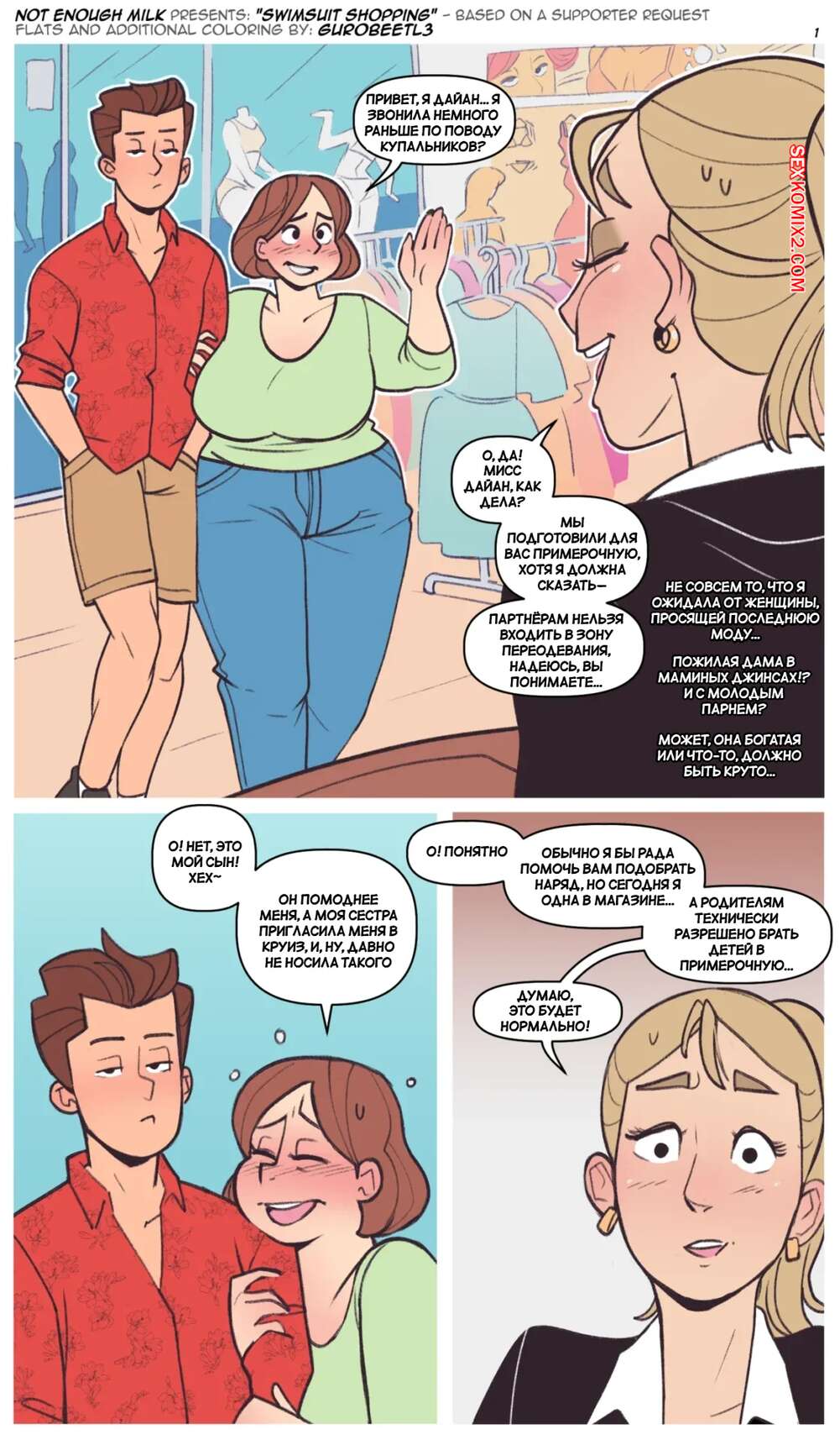 Порно комикс Покупка купальника. Swimsuit Shopping. NotEnoughMilk. Горячая милфа пригласила сына с собой в магазин, чтобы выбрать ей купальник. Парнишка возбудился при виде аппетитного тела мамочки, поэтому они поспешили вернуться домой, чтобы трахнуться.