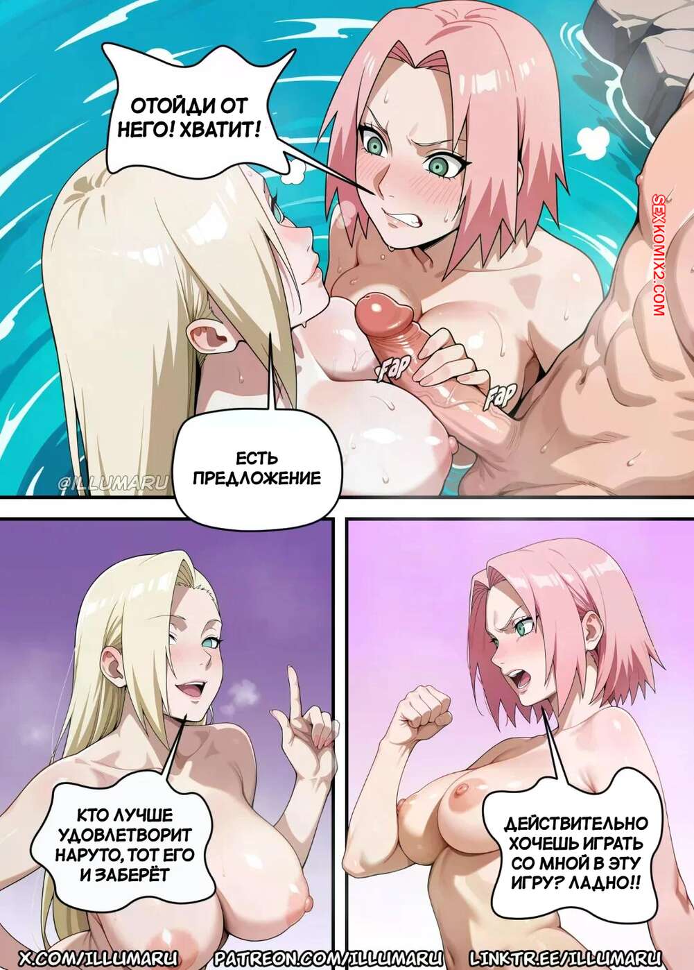 Порно комикс Наруто. Очень горячие источники. Часть 4.1 и 4.2. Very Hot Springs. Illumaru Сакура и Ино отправились на горячий источник расслабиться, где компанию им составил Наруто. Девушки стали у него отсасывать, после чего парень создал теневых клонов и выебал подруг во все дырочки.