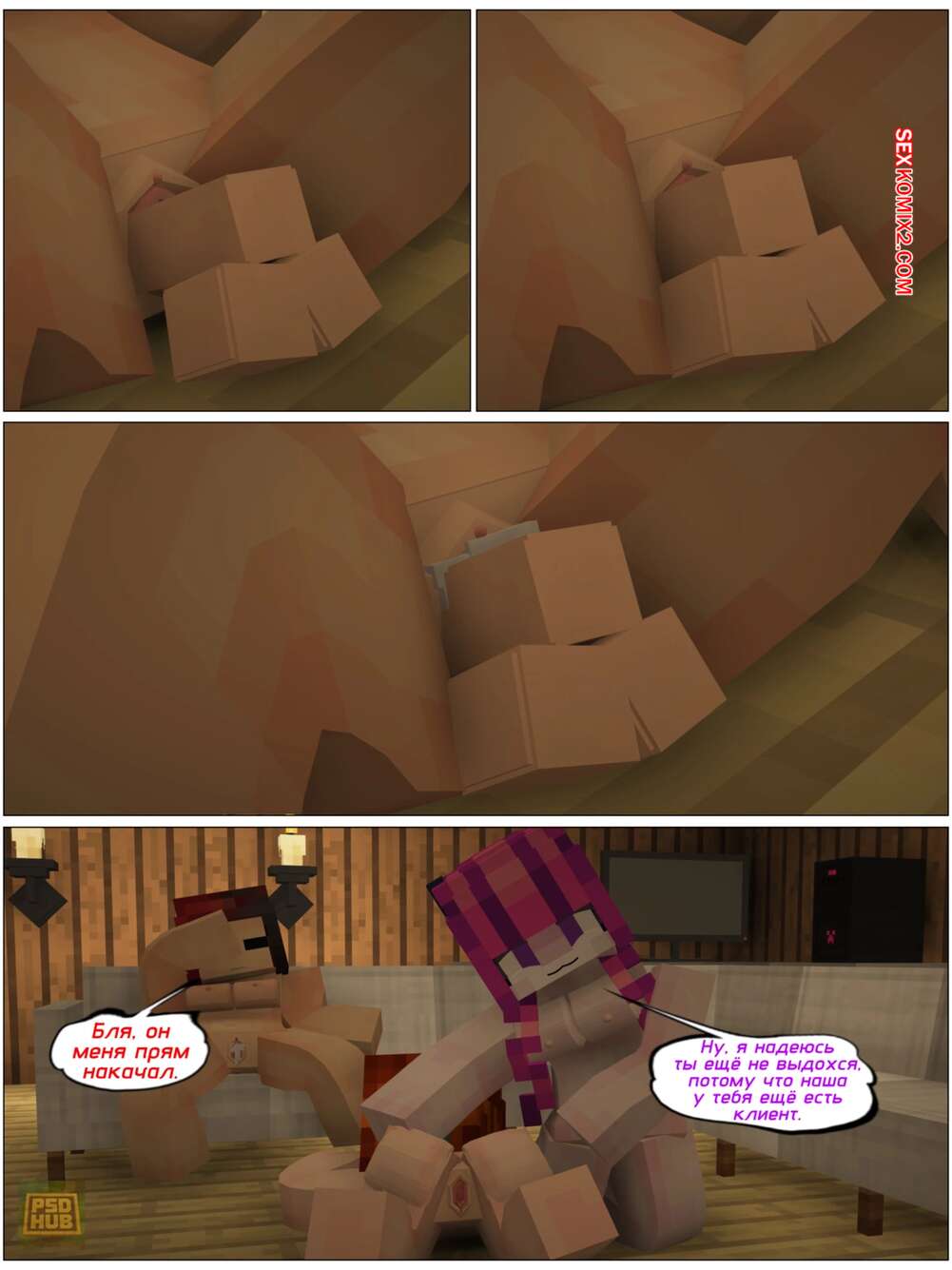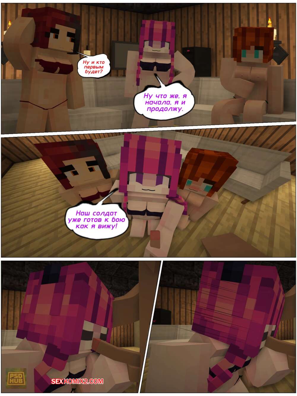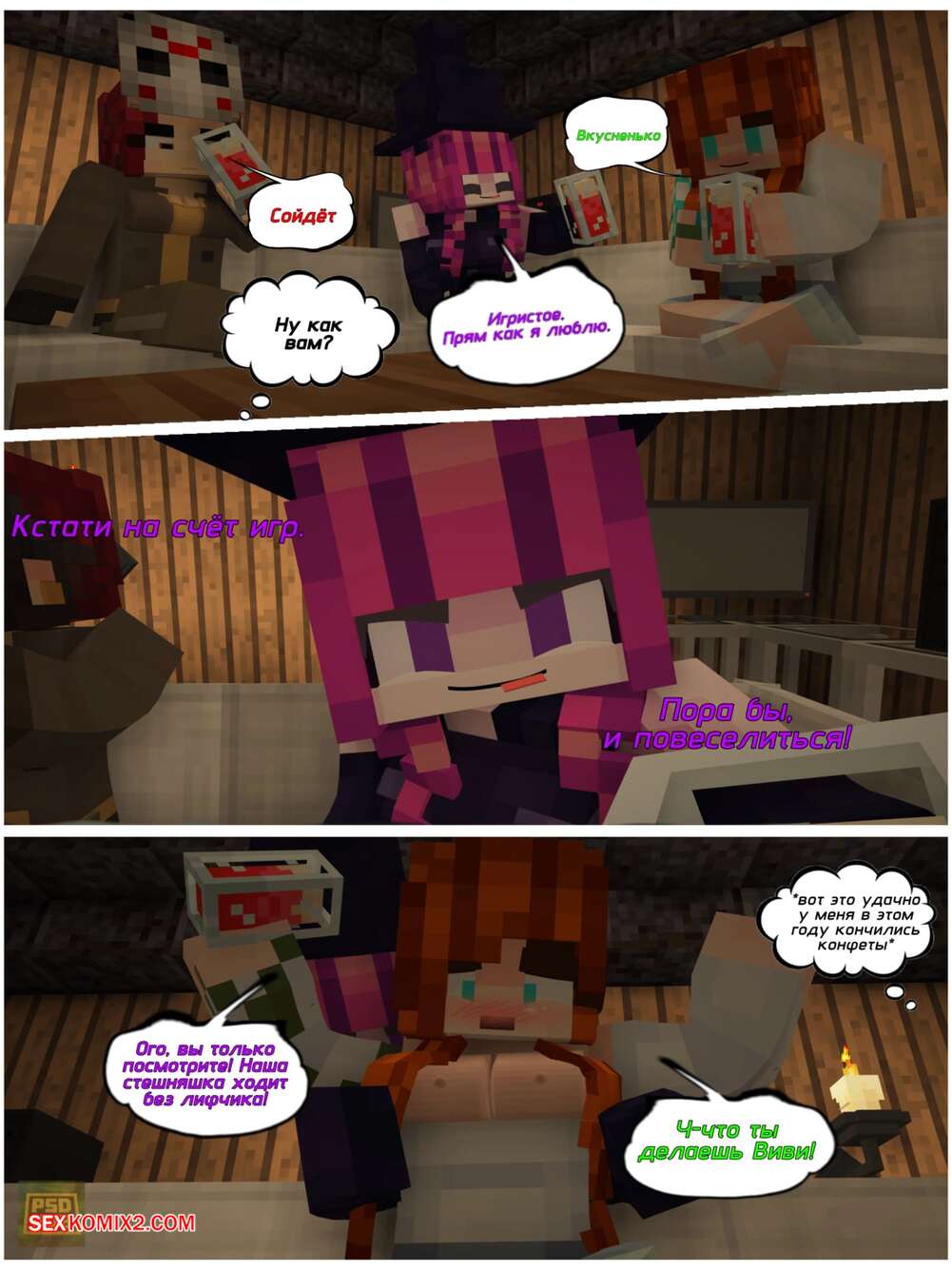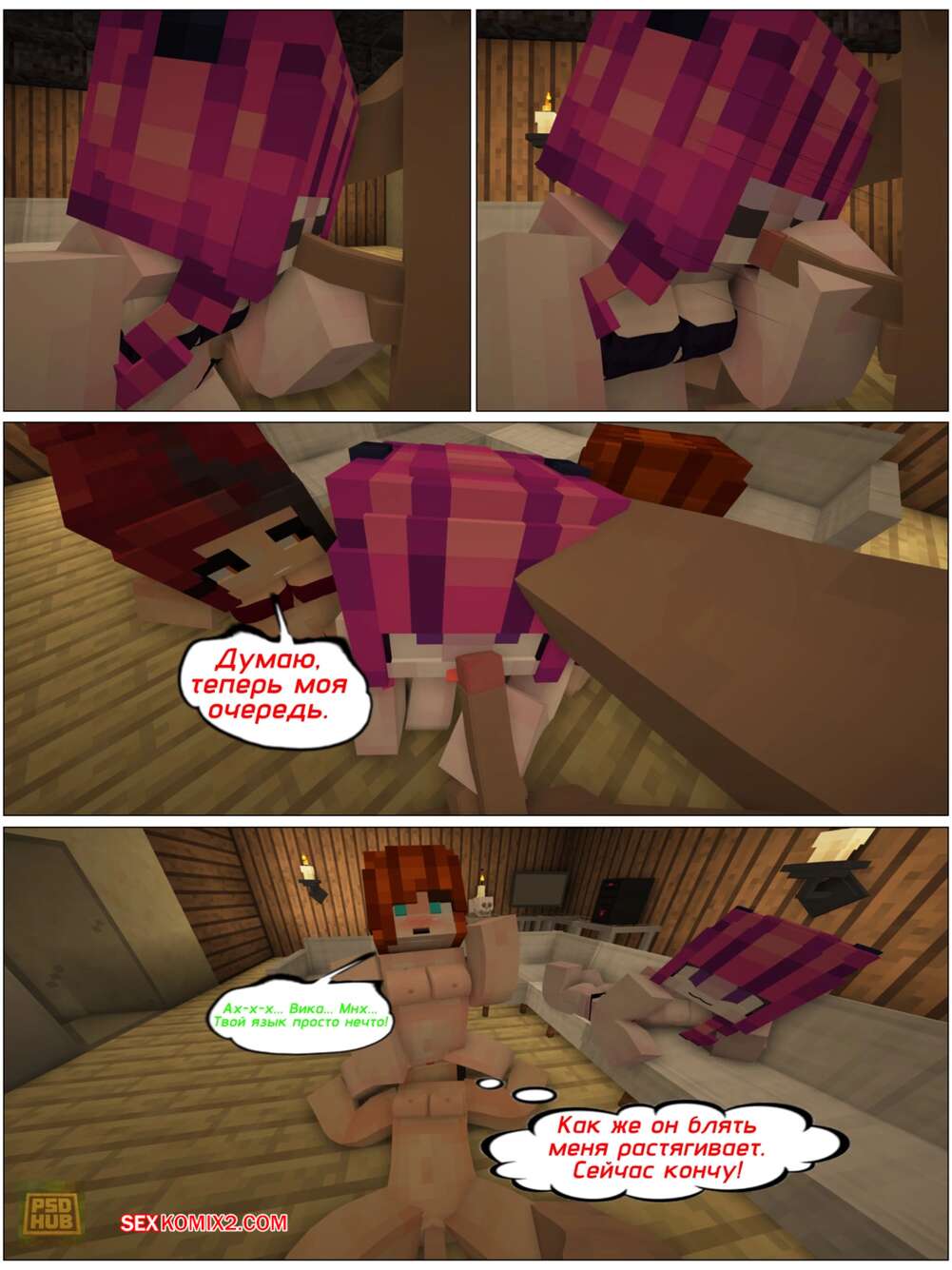 Порно комикс Minecraft. Когда удачно кончились конфеты. PSDhub Девушки в Майнкрафте навещают своего дружка, желая повеселиться с ним. Красотки встали на колени и отсосали хуй парня, после чего раздвинули ножки и дали себя выебать.