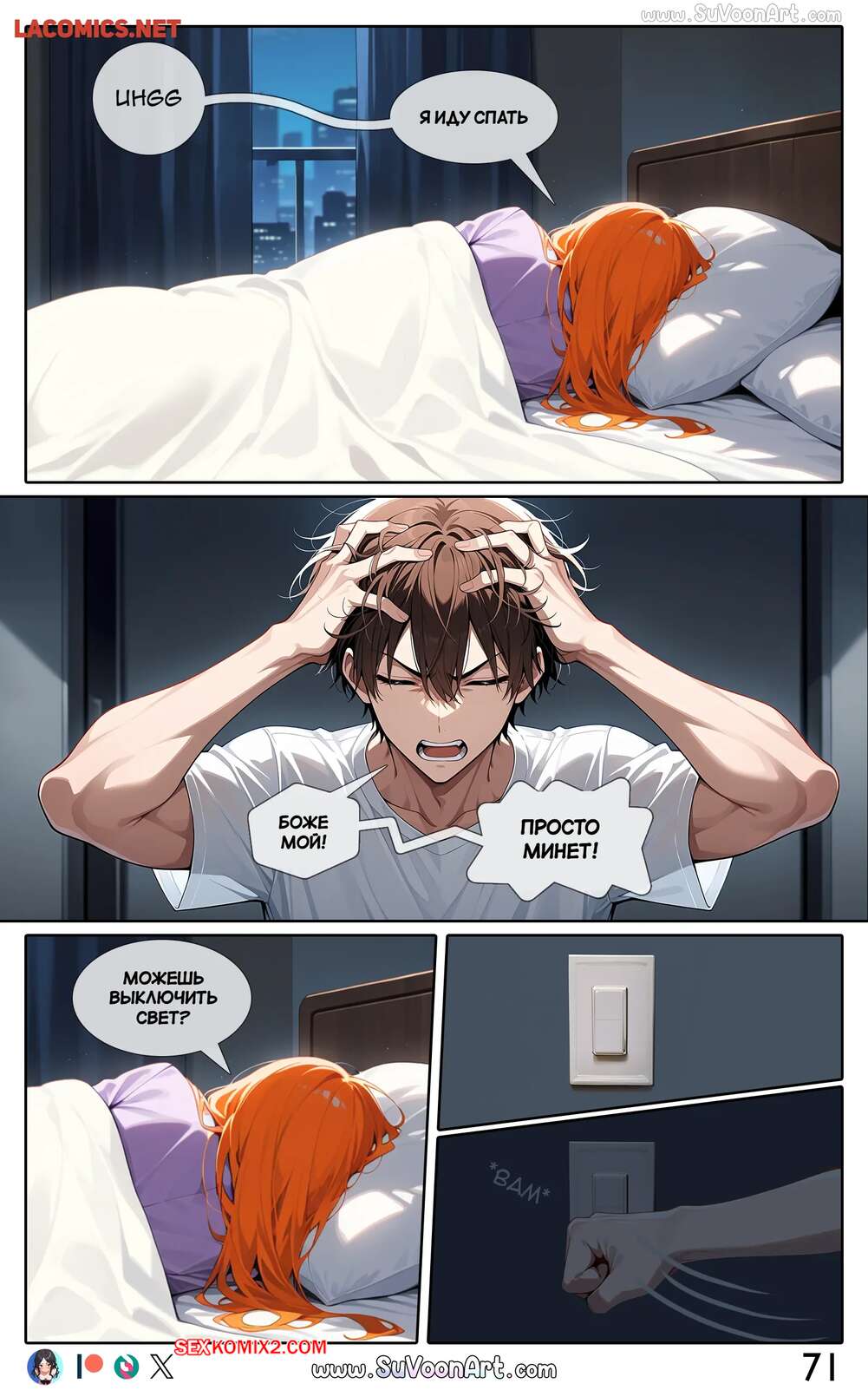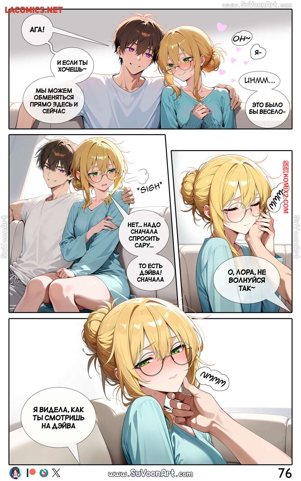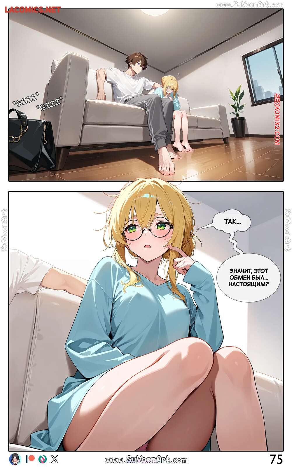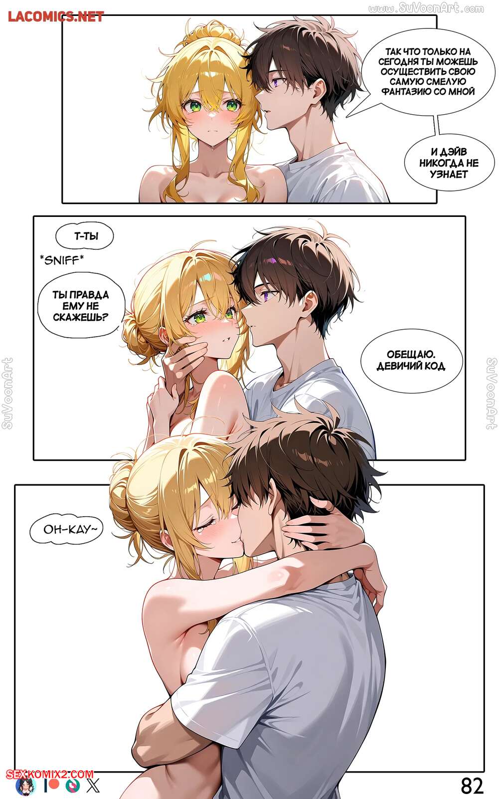 Порно комикс Другая сторона. Часть 4. The Other Side. SuVoonAr Парень с девушкой сидели в гостинной и блондиночка стала к нему приставать, желая пошалить. Она разделась и возбудила парня шикарным телом, после чего раздвинула ножки и дала ему себя выебать.