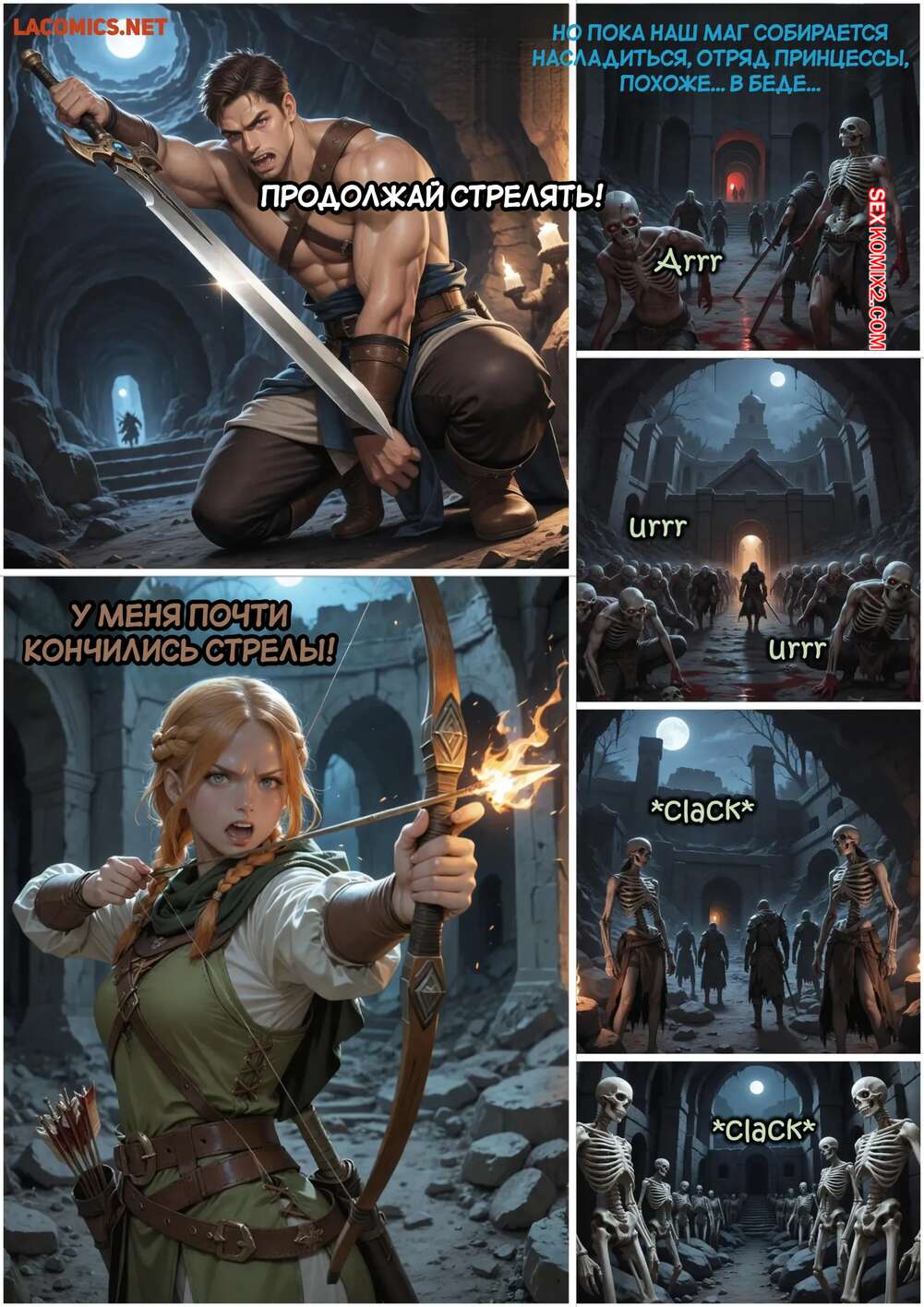 Порно комикс Принцесса и маг. Часть 4. The Princess and the Mage. HexxetVal. Возбужденные красотки разделись перед парнем и возбудили его аппетитными формами. Девушки уложили парня на землю и оседлали его член, чтобы он их хорошенько выебал.