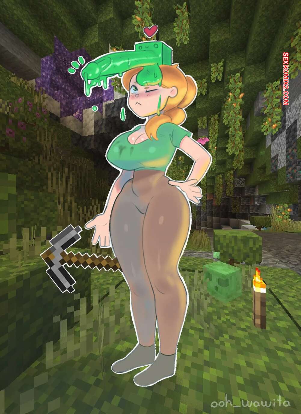 Порно комикс Alex and Slime. Minecraft. Wawita Слайм принял форму члена и рыжая красотка Алекс не смогла устоять. Она оголила свои большие сиськи и стала страстно сосать большой хуй, после чего получила в ротик сперму.