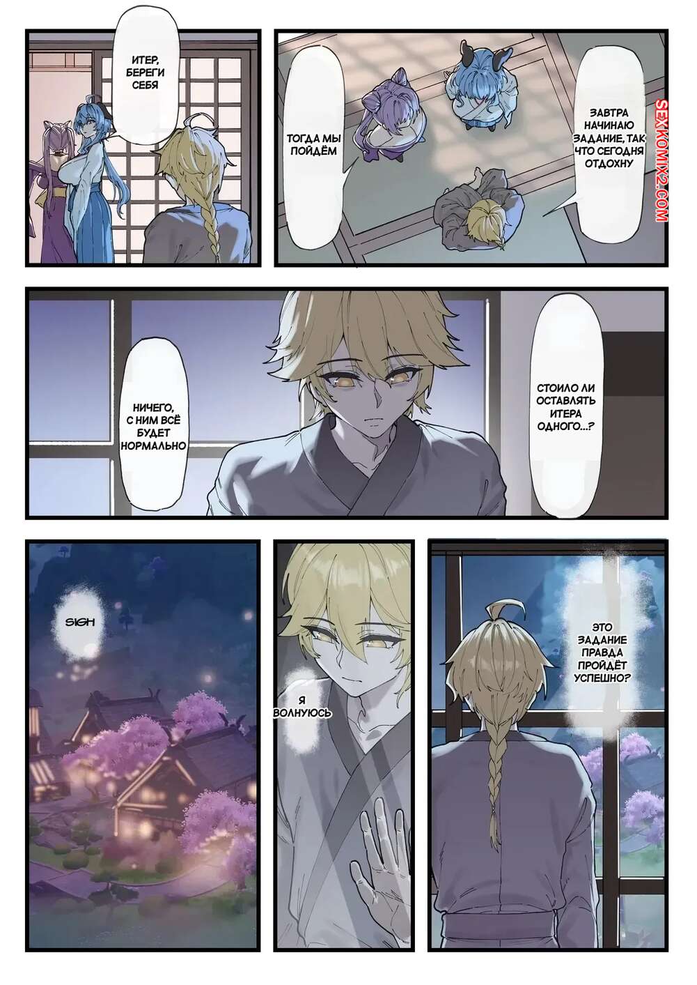 Порно комикс Многонациональная следственная группа Иназума. Maskwolf, Keinv. Парень услышал ночью громкие стоны и пошел проверить в чем дело. За ширмой он увидел силуэты, как его горячих подруг трахают, но не смог ничего сделать, потому что к нему сзади подобралась блондиночка и стала его ласкать.