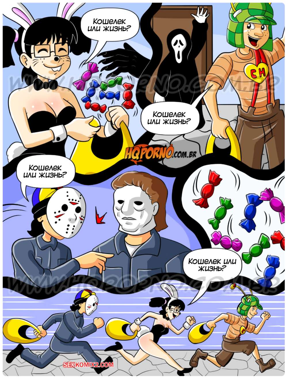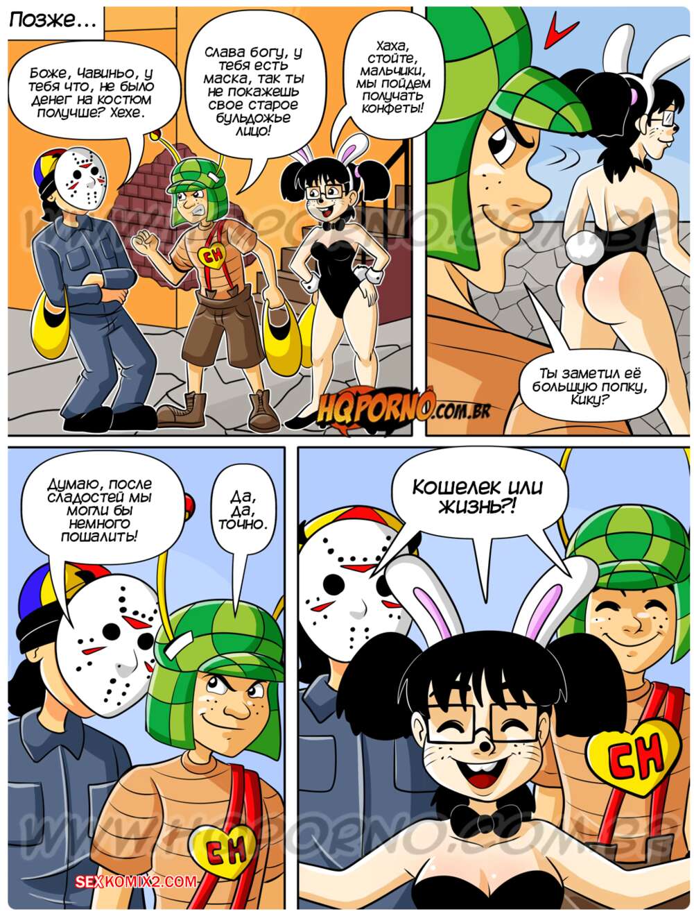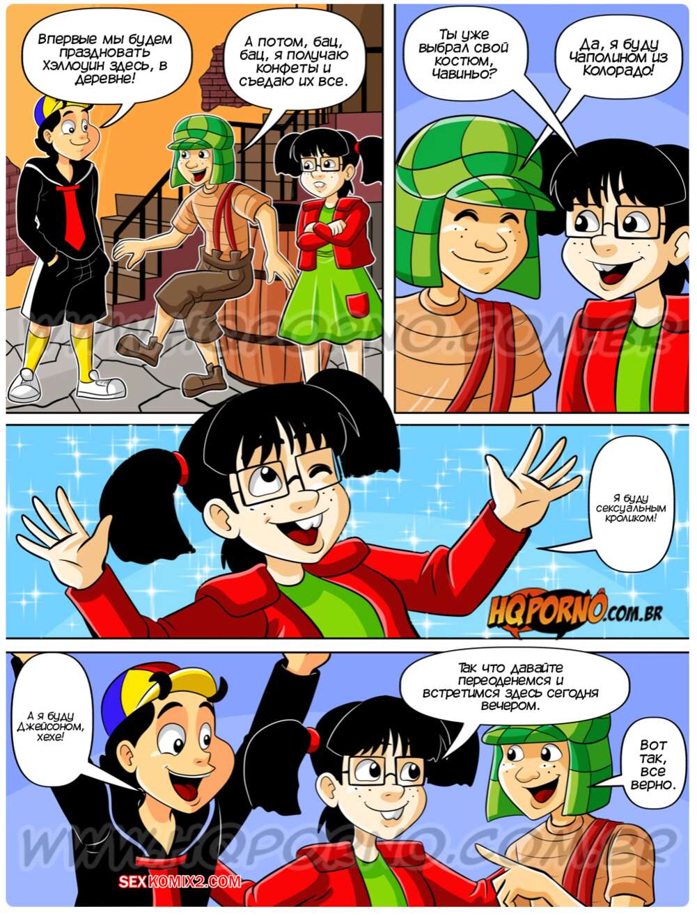 Порно комикс Чавиньо. Часть 27. Chavinho. HQporno Чикита с друзьями надела костюм на Хэллоуин и отправились собирать конфеты. Парни засмотрелись на аппетитную попку девушки и предложили ей повеселиться и потрахаться.