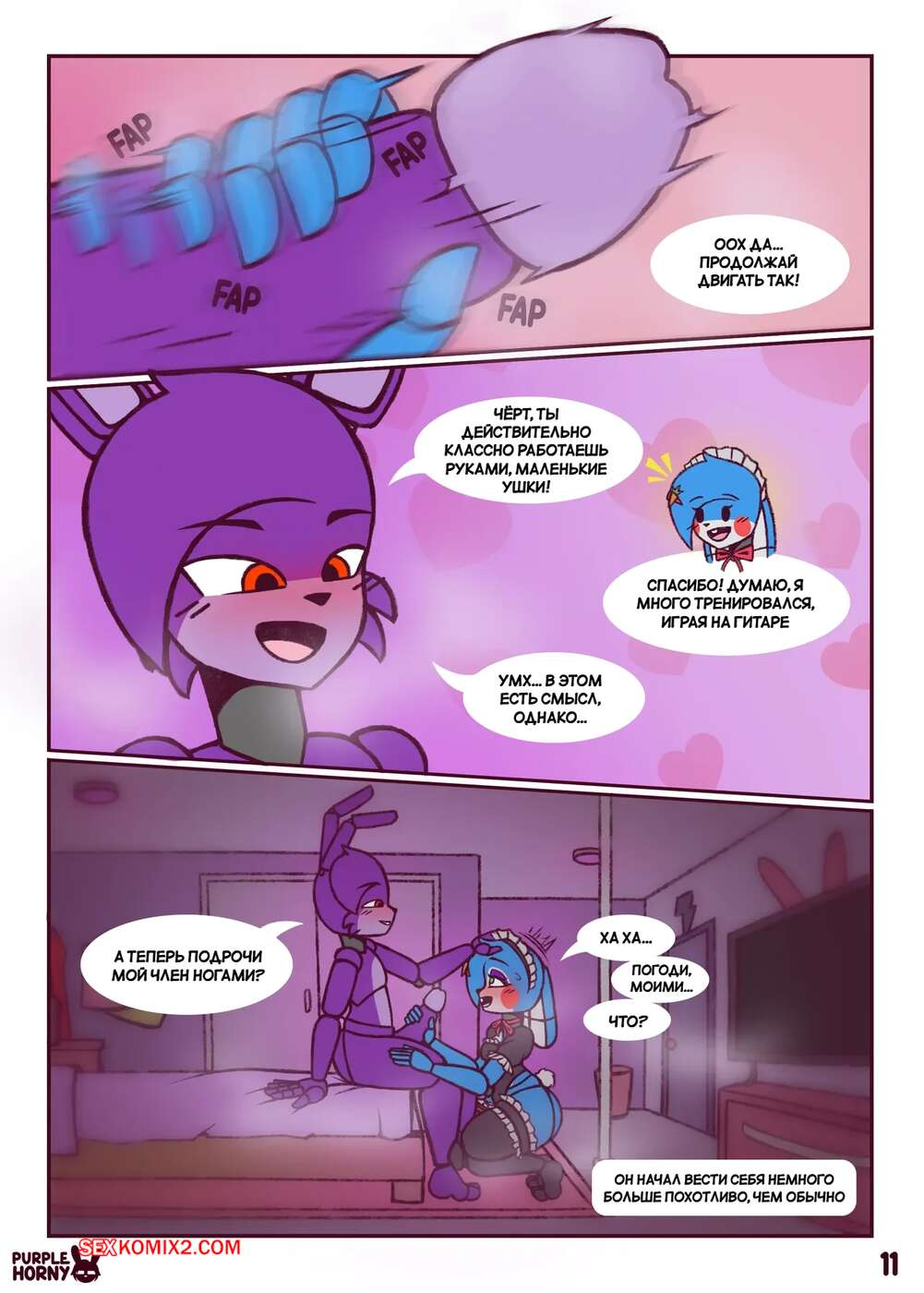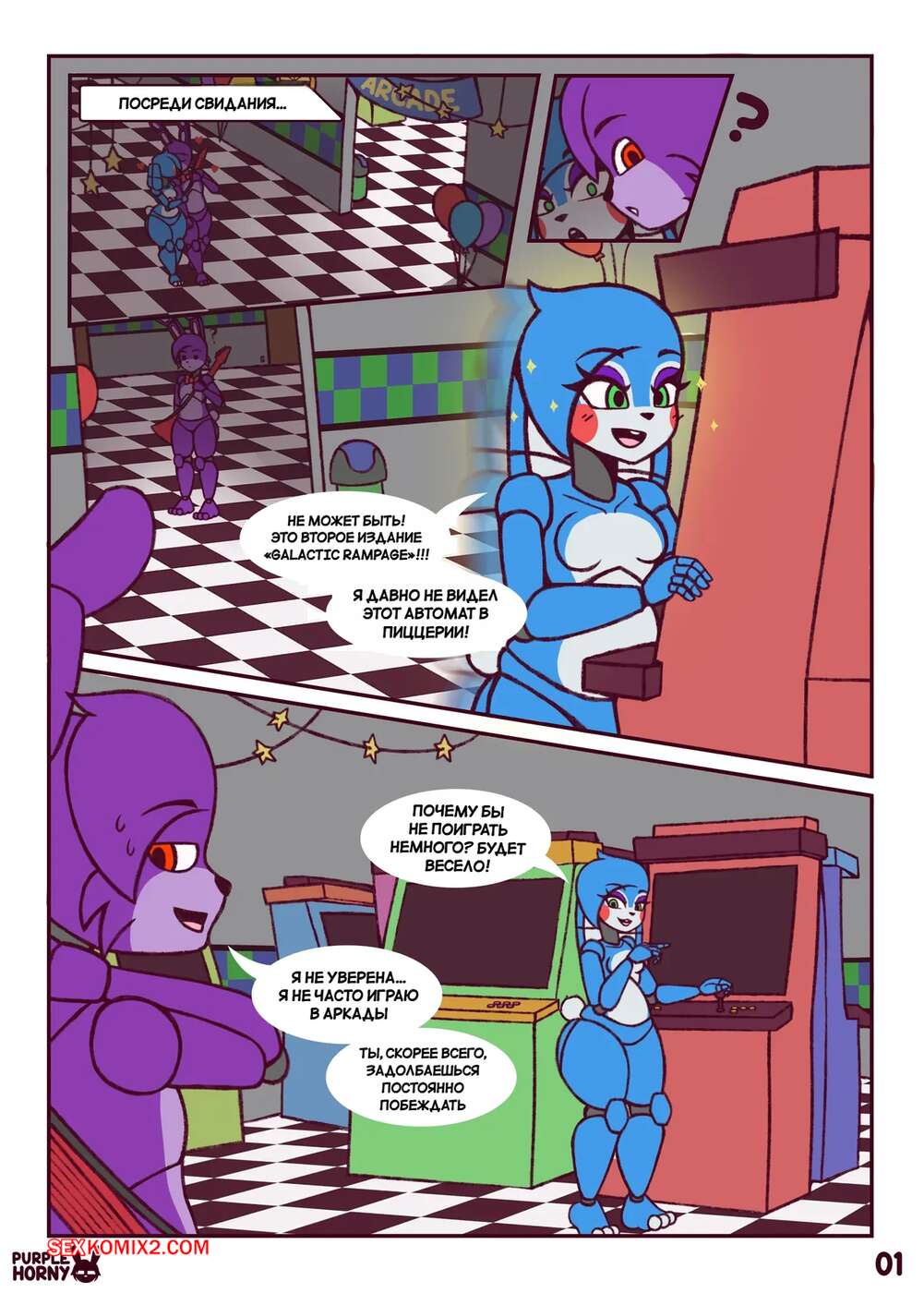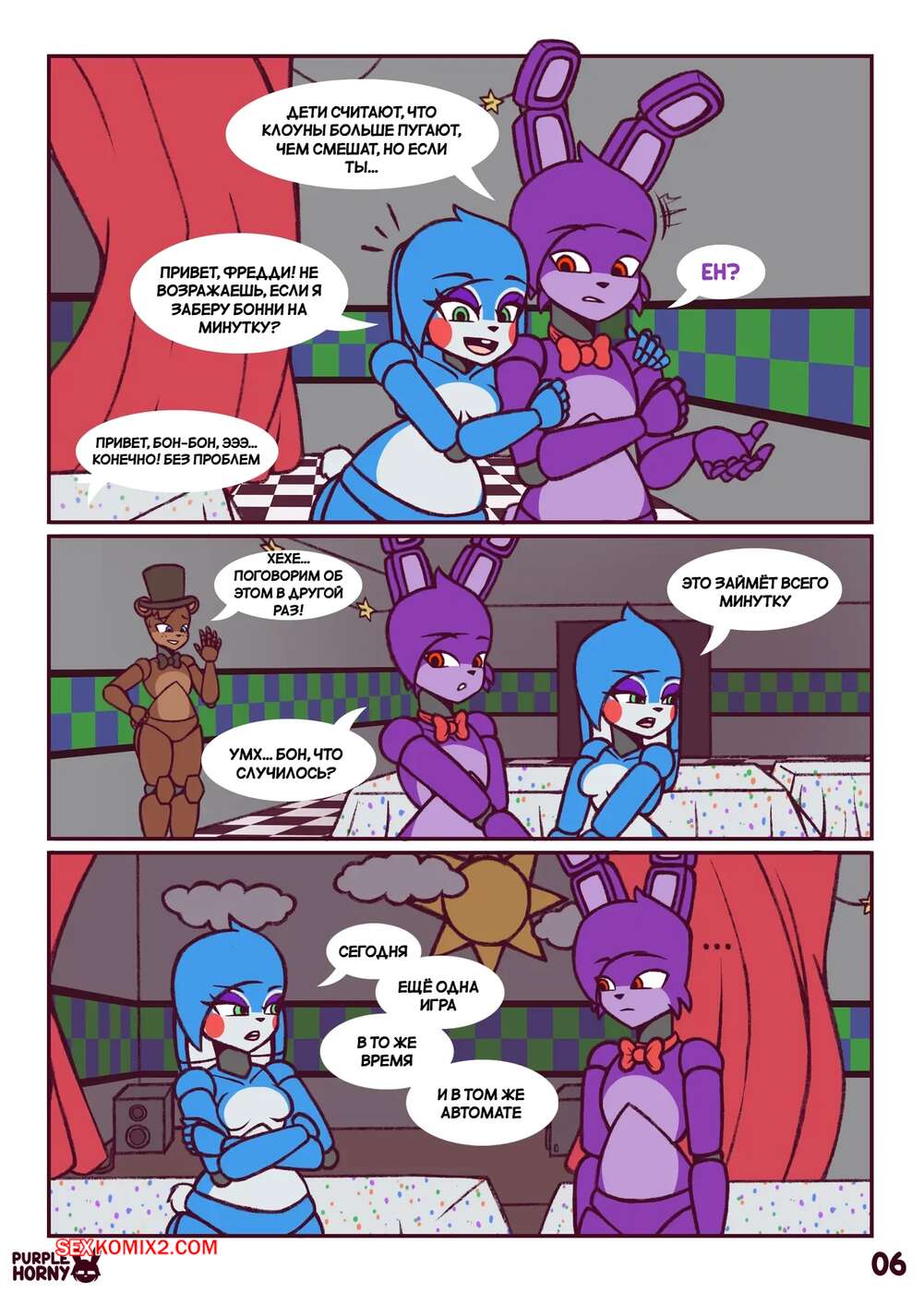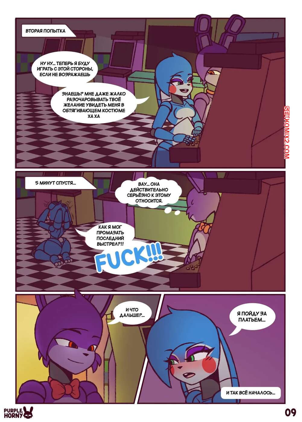 Порно комикс Five Nights at Freddys. Пари. The Bet. PurpleHorny. Возбужденная красотка отправилась в комнату к своему дружку, желая повеселиться. Девушка встала на колени и отсосала его большой член, после чего раздвинула ножки и дала себя выебать.