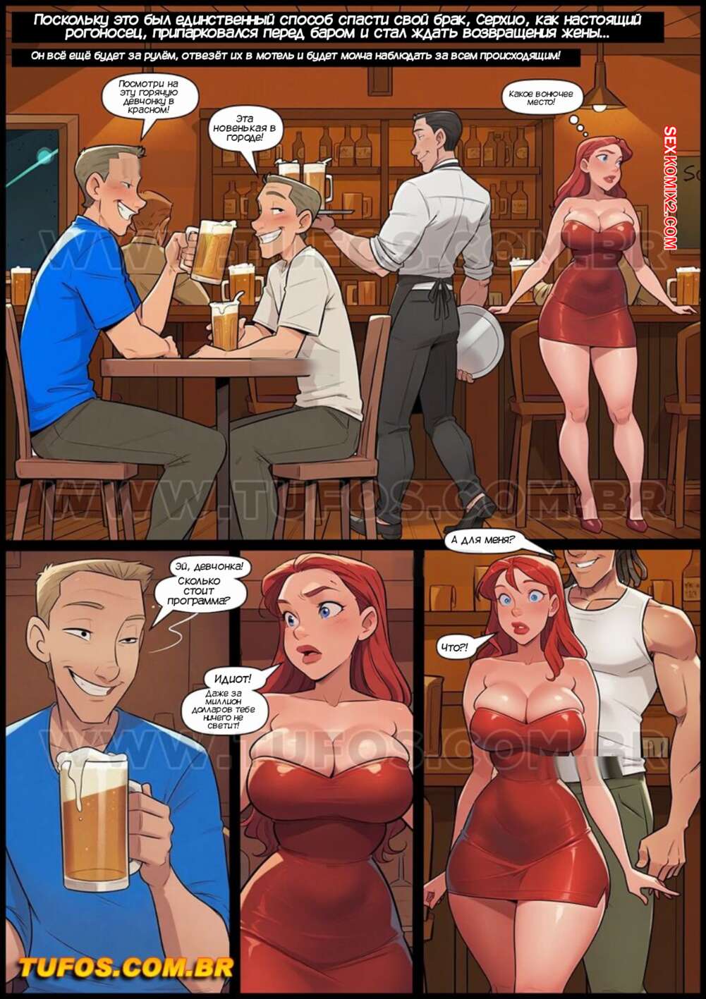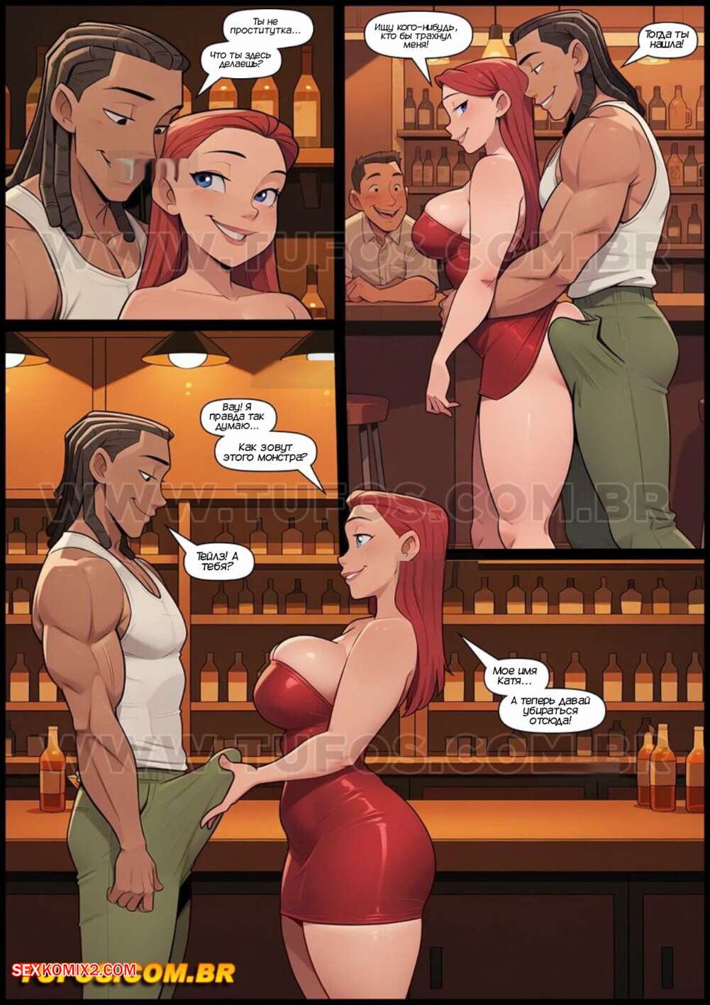Порно комикс Анаконды. Часть 16. Anacondas. Tufos Красотка Катя спалила своего мужа за изменой и решила ему отомстить. Красотка нашла в баре симпатичного парня и отправилась с ним в мотель, чтобы он выебал ее во все дырочки, пока е муж наблюдал за этим.