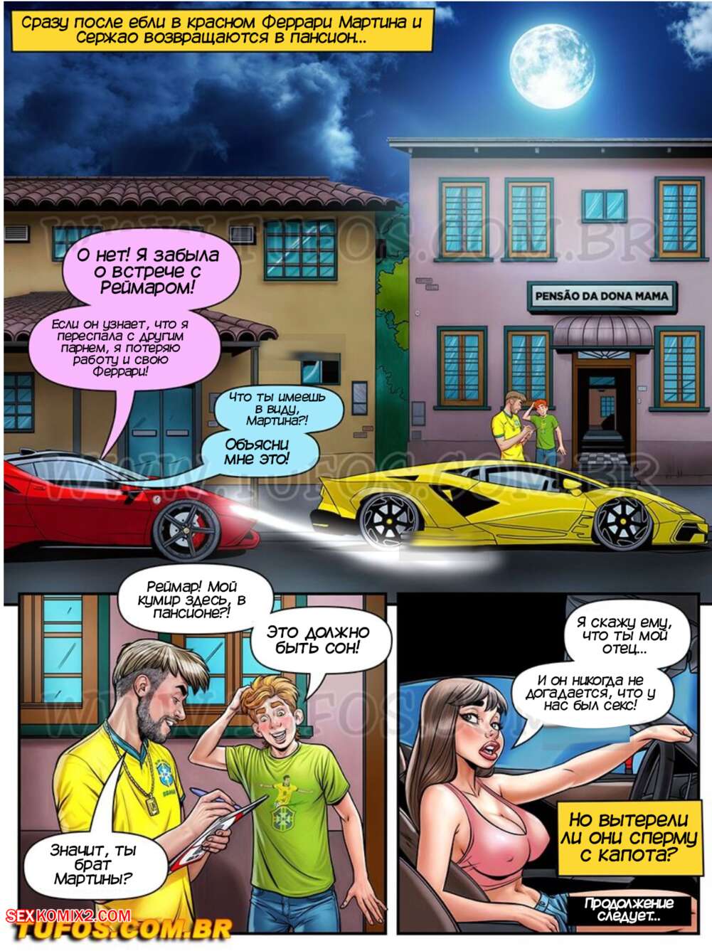 Порно комикс Донья Мама. Часть 15. Dona Mama a maezona da galera. Tufos Мартина пригласила своего отца проехаться вместе на ее Феррари. Красотка соблазняет Сержао и сосет его член, после чего раздвигает ножки и дает себя хорошенько выебать в пизду и задницу.