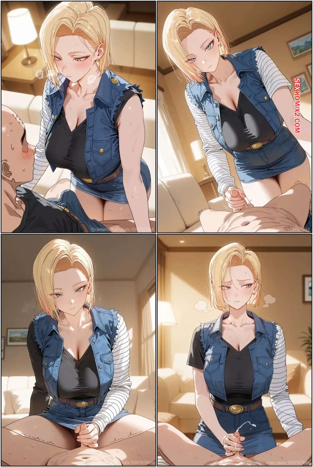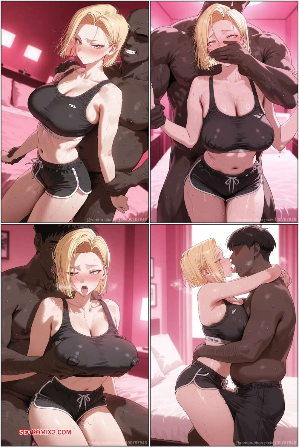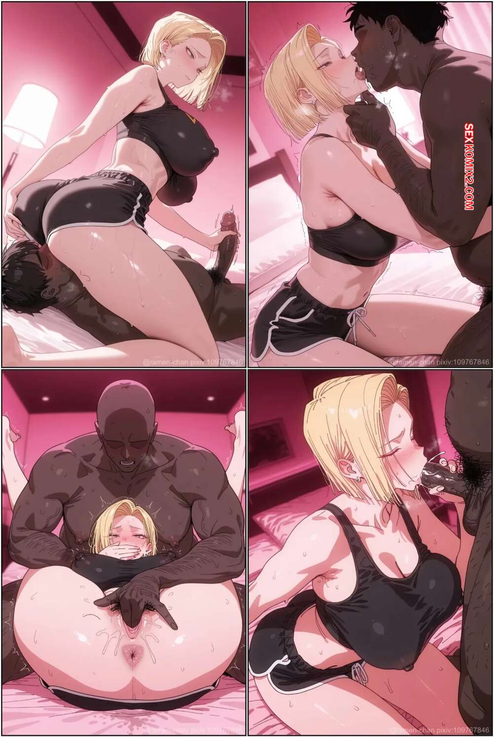 Порно комикс Android 18. Ramen chan Красотка Андроид 18 встретилась с темнокожим парнем, желая получить настоящее удовольствие от секса. Она встала на колени и глубоко заглотила его член, после чего дала себя выебать.