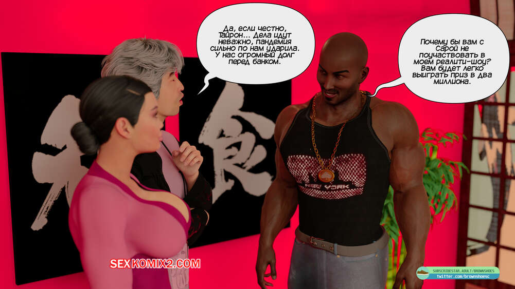 Порно комикс Изменяющие шлюхи бимбо жены. Часть 3. Cheating Sluts Bimbo Wifes. Brown Shoes У Араты возникли проблемы с деньгами и Тайрон предложил ему и его жене принять участие в его шоу. Красотке пришлось позировать рядом с голым темнокожим парнем, после чего он ее хорошенько выебал.