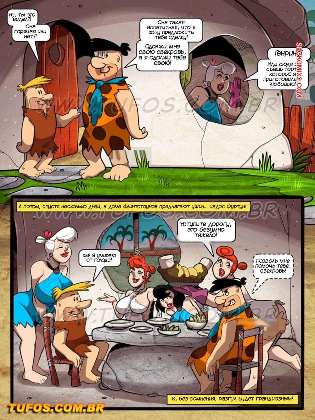 Порно комикс Флинстоуны. Часть 21. Os Flintstoons. Tufos Барни и Фреди договорились поменяться тещами и трахнуть их. Наконец пришел момент и парни сперва стали трахать своих жен и их матерей, после чего устроили глобальный обмен.