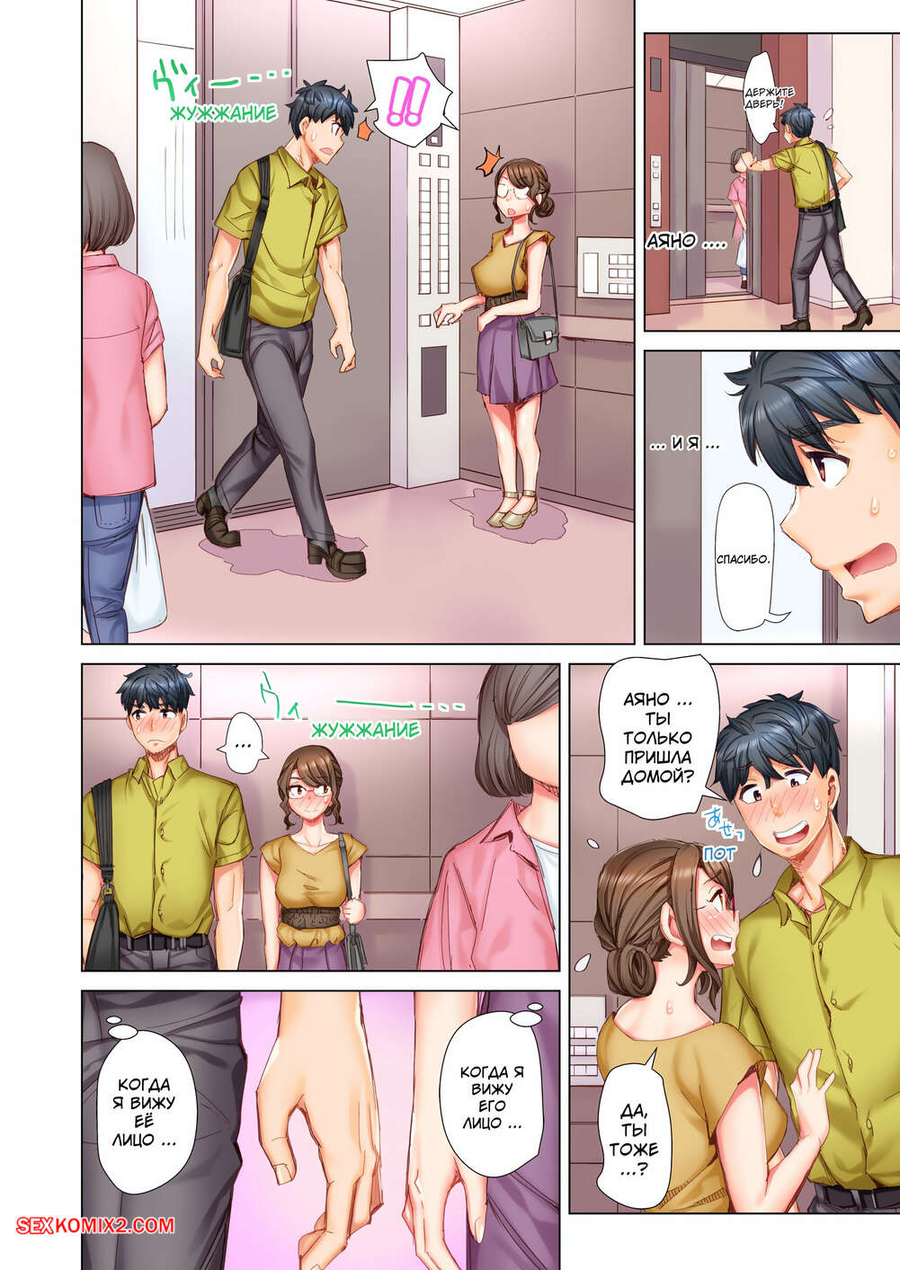 Порно комикс Выходи за меня замуж. Без цензуры. Часть 7 и 8 и 9 Парень с девушкой ехали в лифте и возбудились, вспоминая свой секс. Они стали страстно целоваться, после чего поспешил в квартиру, чтобы заняться сексом на полу.