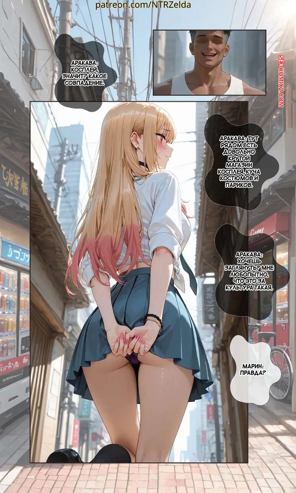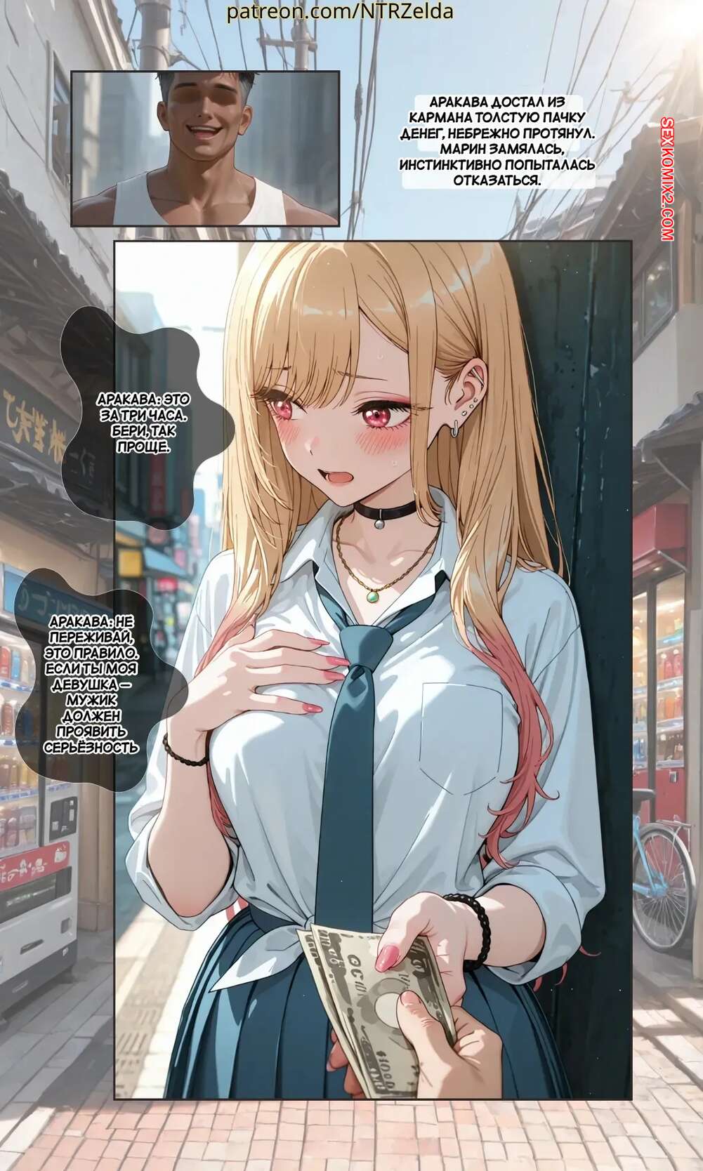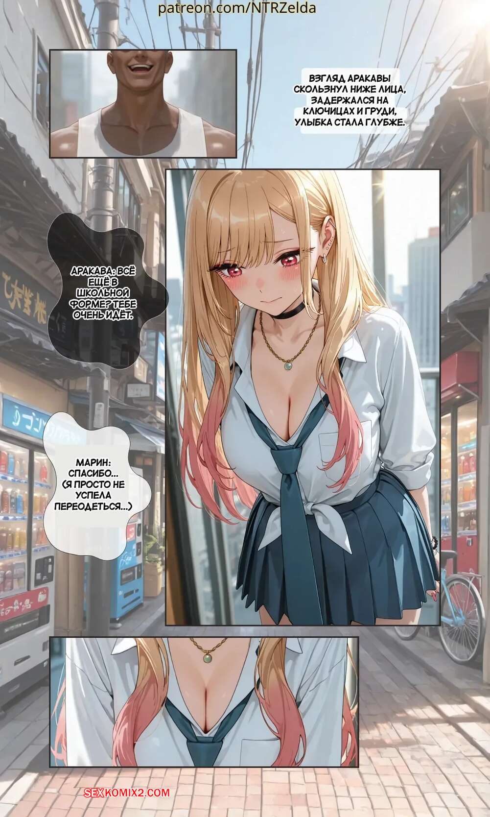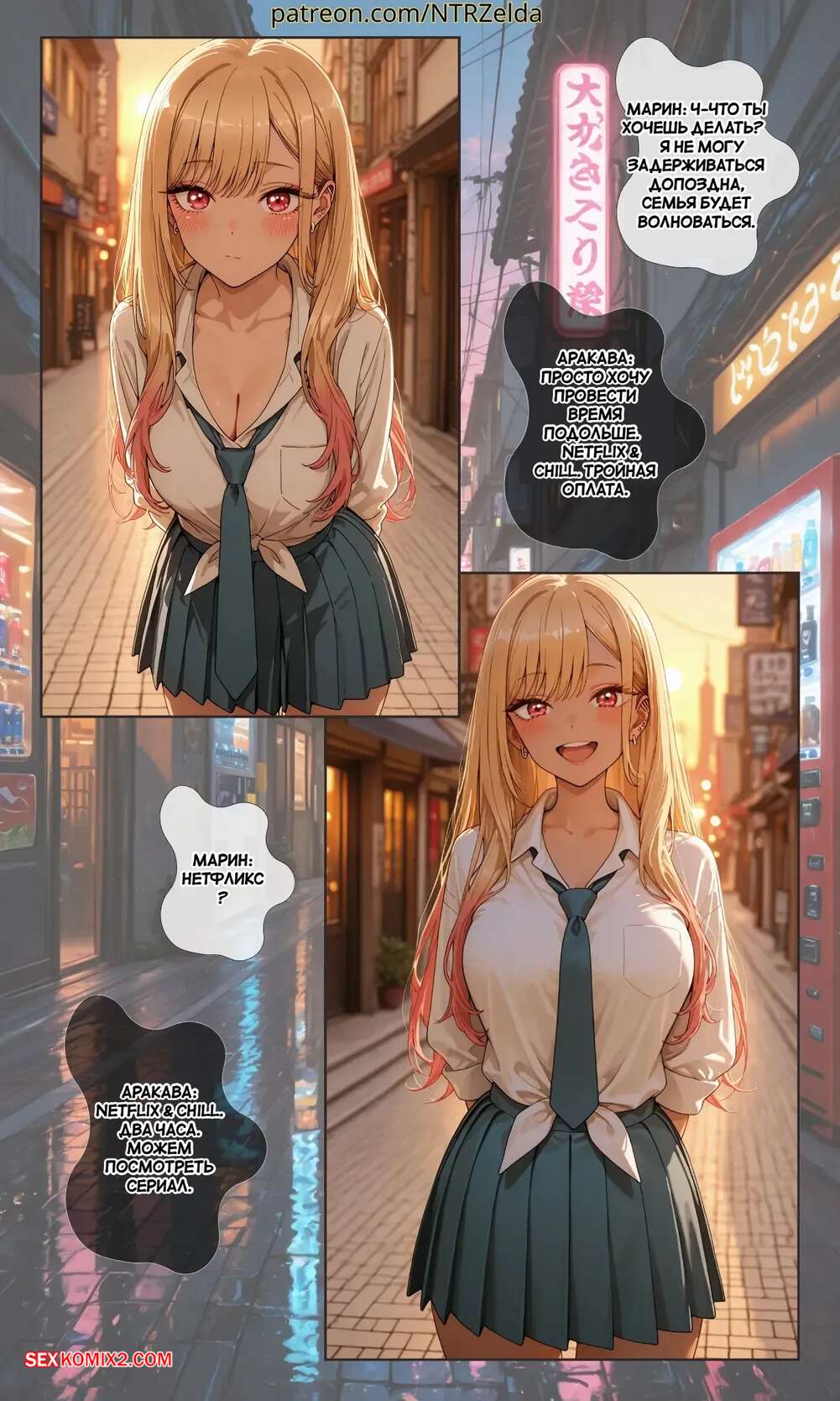 Порно комикс За закатом. Китагава. Beyond The Sunset. Kitagawa. NTRzelda. Парень пригласил горячую блондинку к себе домой, желая повеселиться. Он раздел сучку и поставил ее на колени, после чего сунул ей в рот свой член, чтобы она ему отсосала.