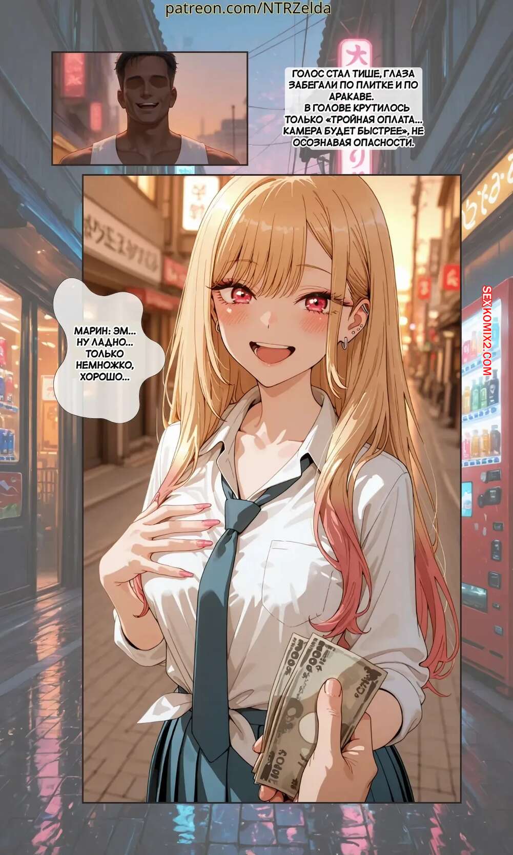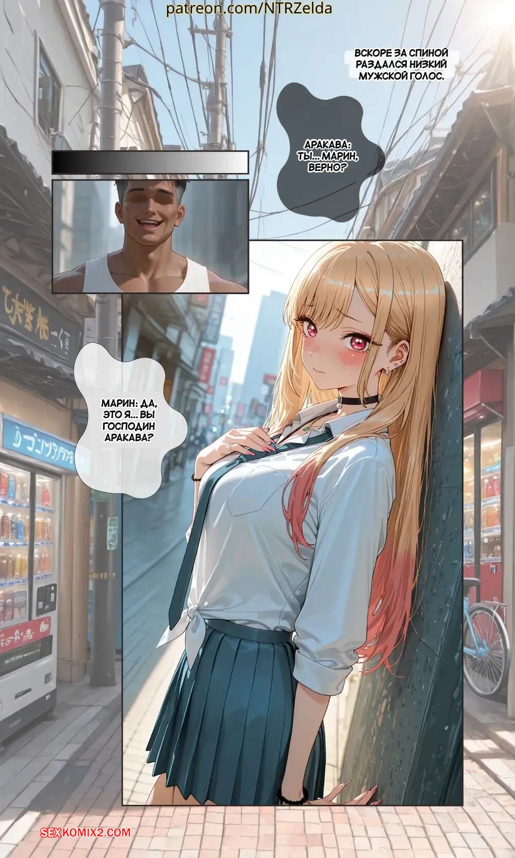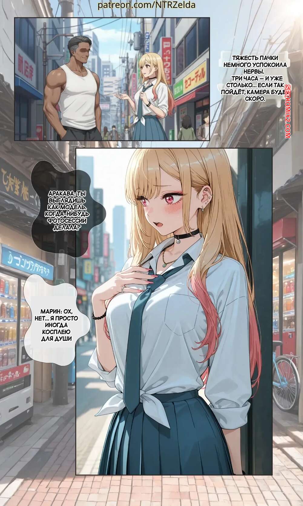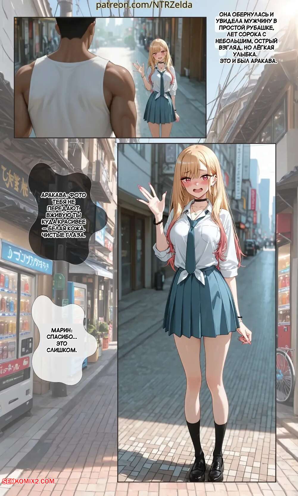 Порно комикс За закатом. Китагава. Beyond The Sunset. Kitagawa. NTRzelda. Парень пригласил горячую блондинку к себе домой, желая повеселиться. Он раздел сучку и поставил ее на колени, после чего сунул ей в рот свой член, чтобы она ему отсосала.