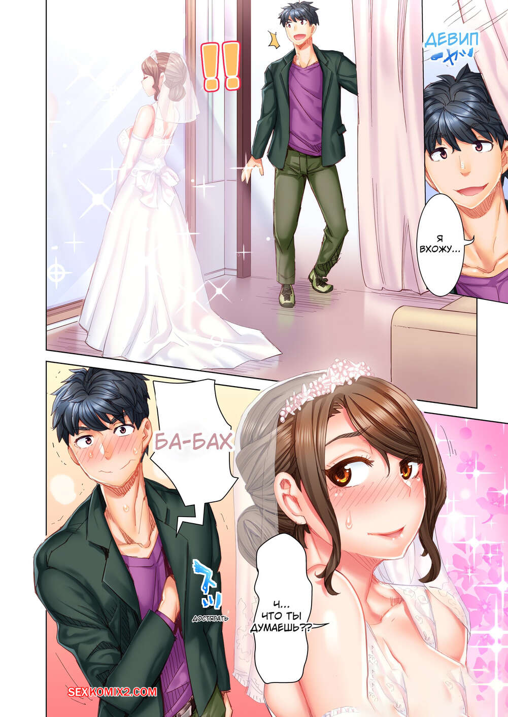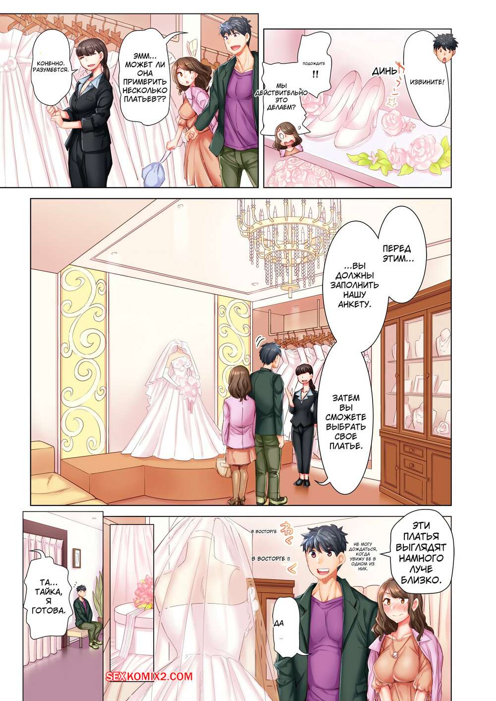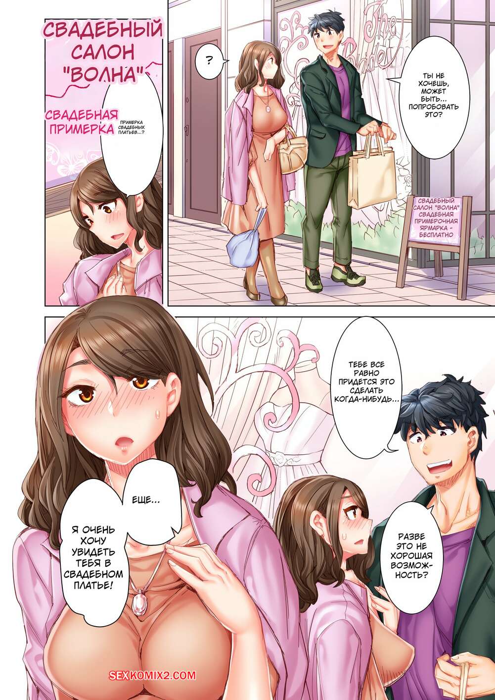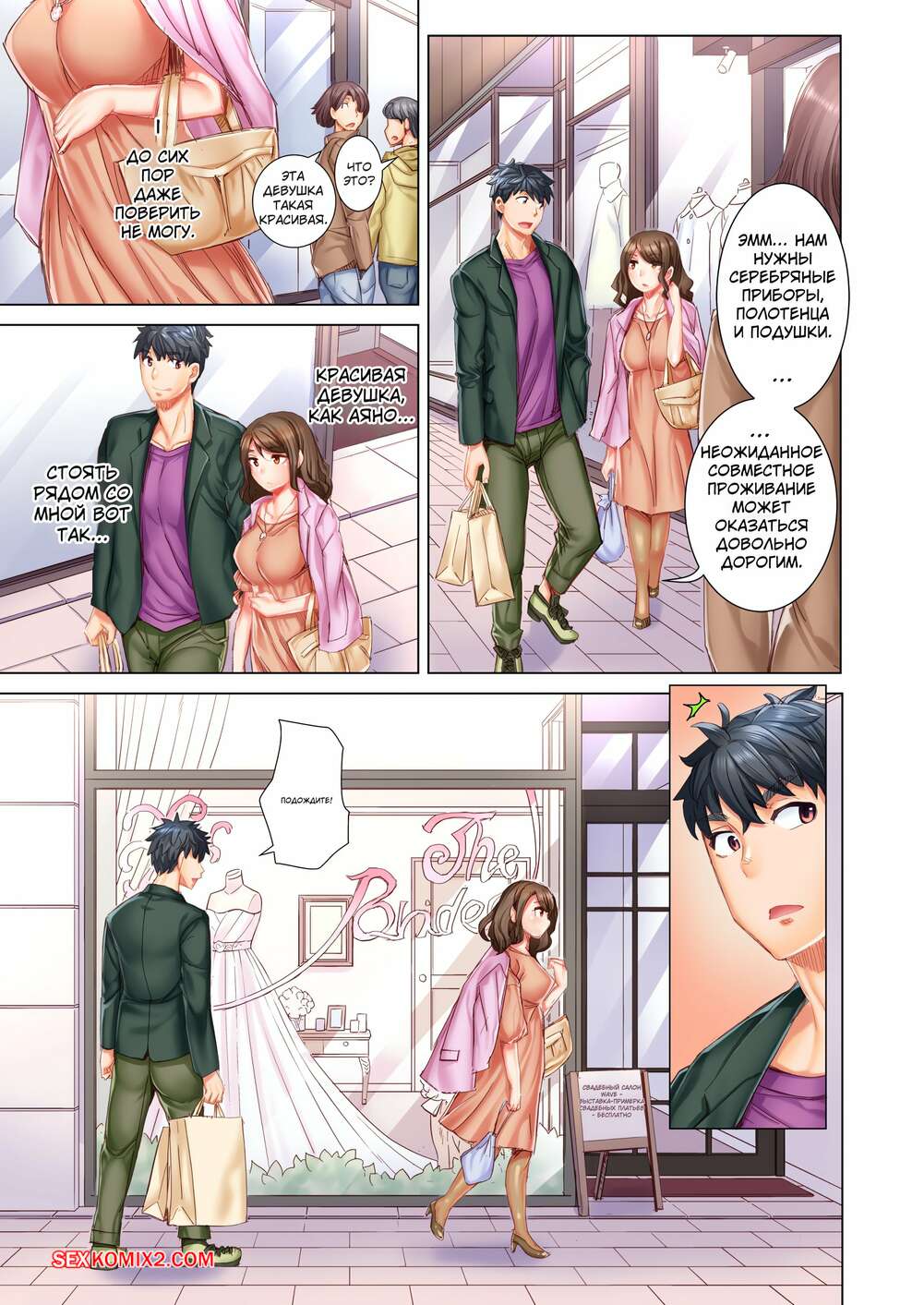 Порно комикс Выходи за меня замуж. Без цензуры. Часть 16 и 17 и 18 Парень с девушкой отправились в магазин, где она примеряла свадебное платье. Увидев красотку в красивом платье, парень возбудился и стал лизать ее влажную киску, после чего насадил ее на свой член.