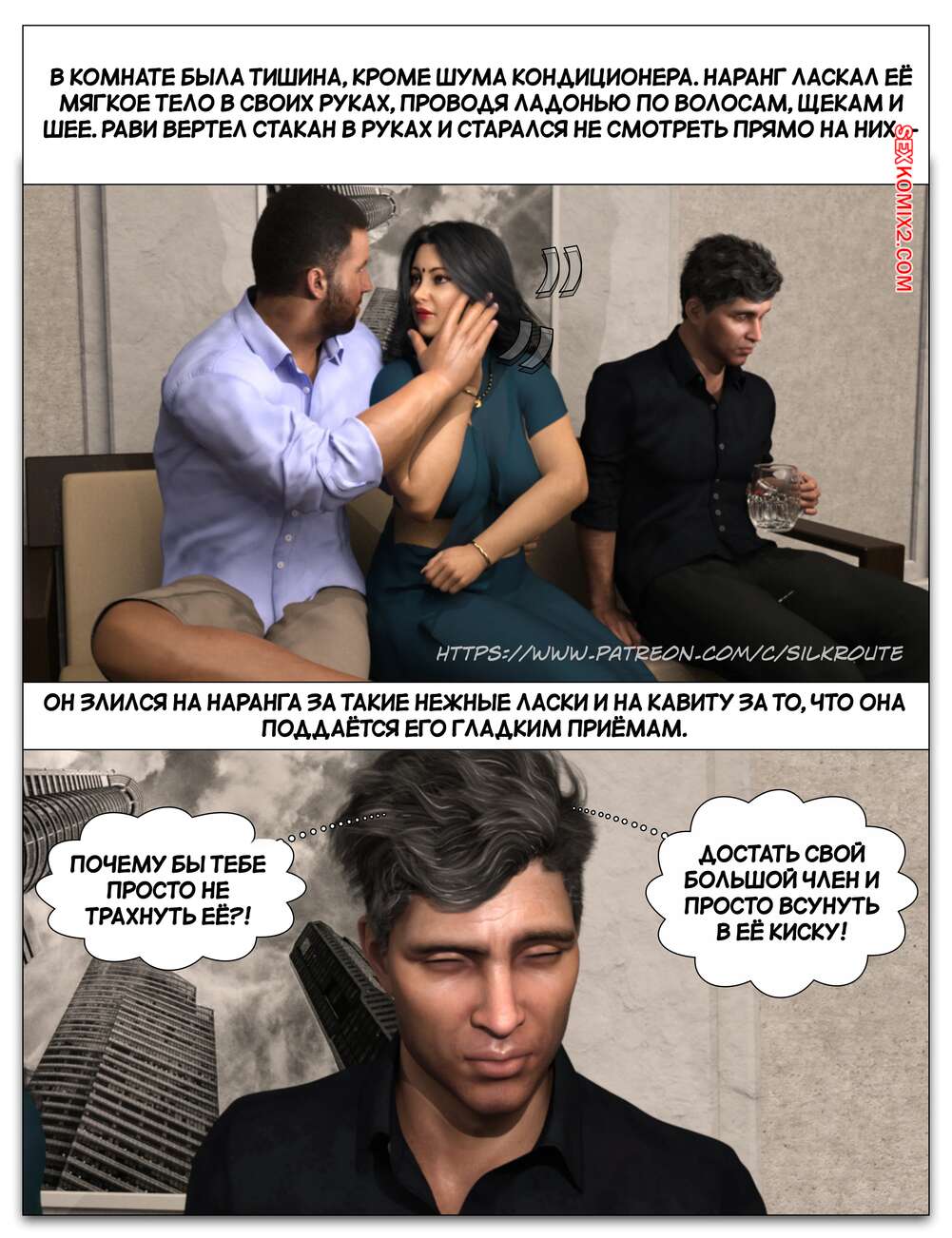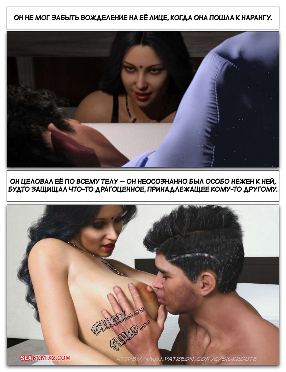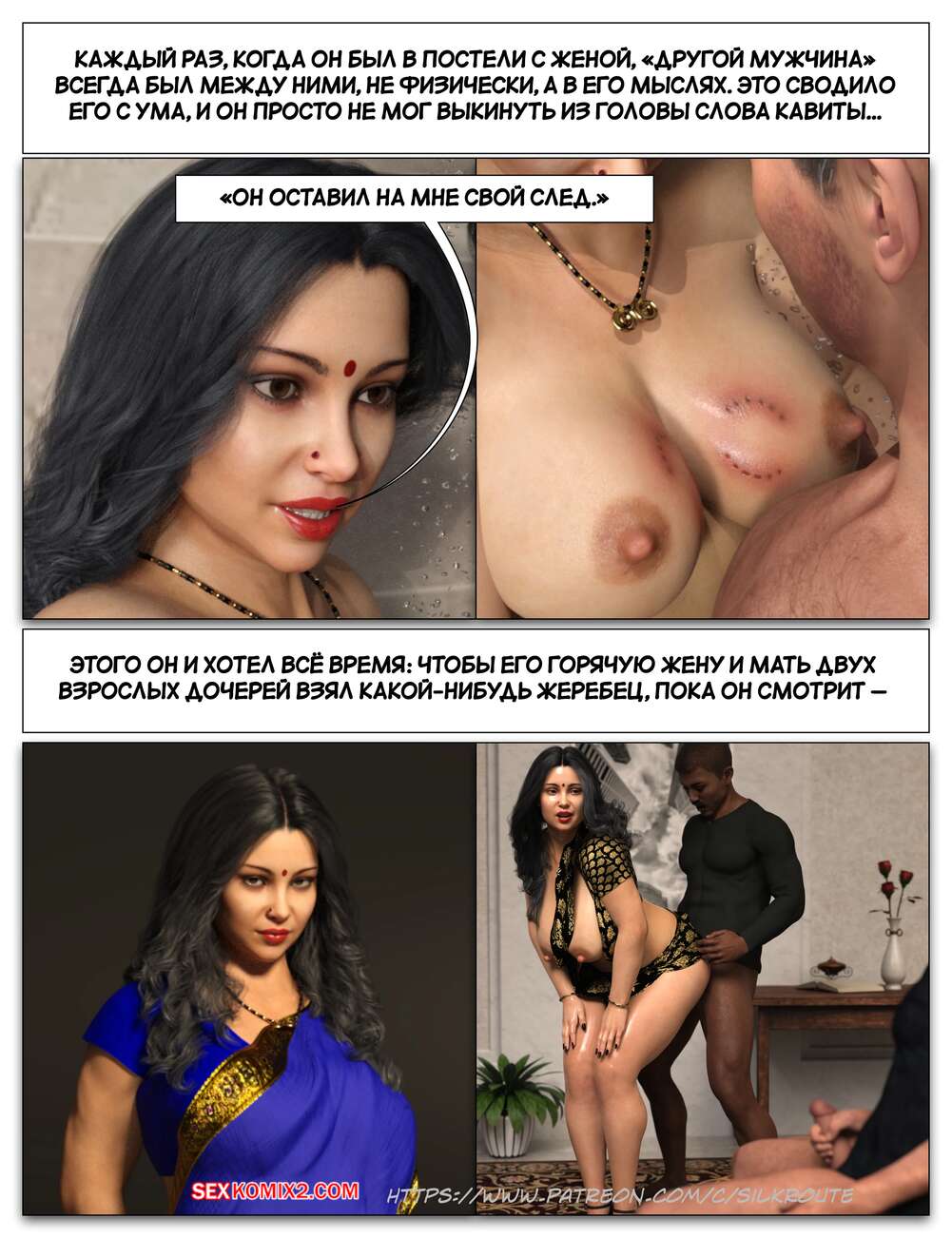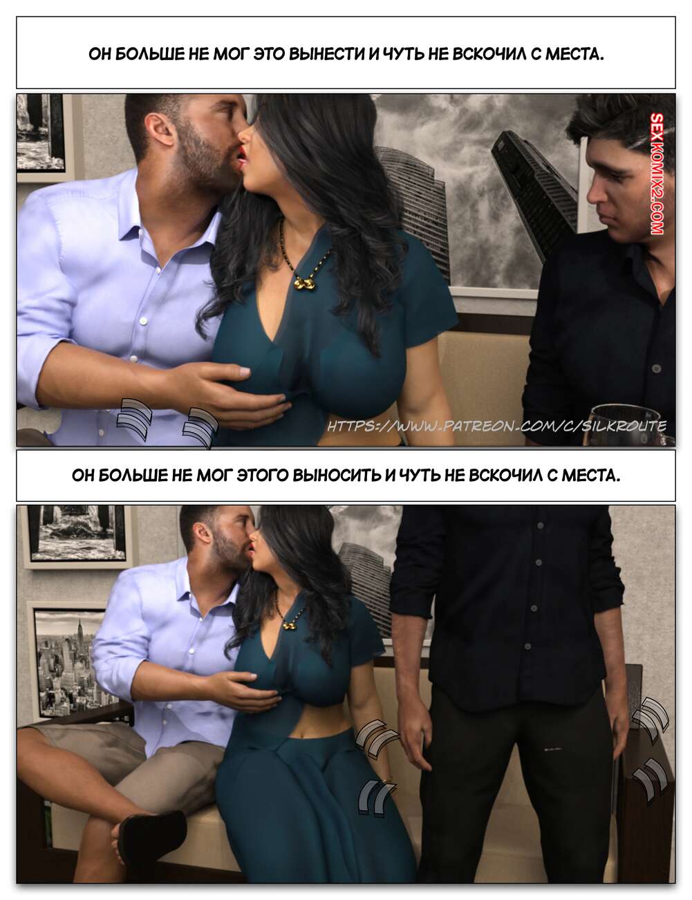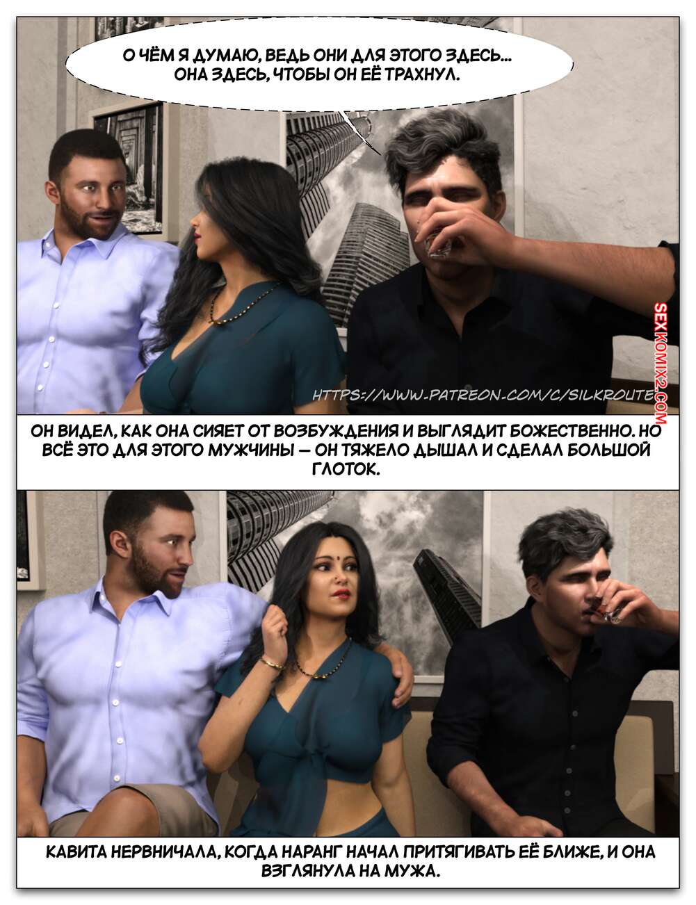 Порно комикс Забрать ее. Часть 3. Take Her. Silk Route Красотка с мужем пригласили к себе домой парня, с которым они ехали вместе. Тот стал целоваться девушку и стянул с нее трусики, после чего взял ее за руку и повел в спальню.