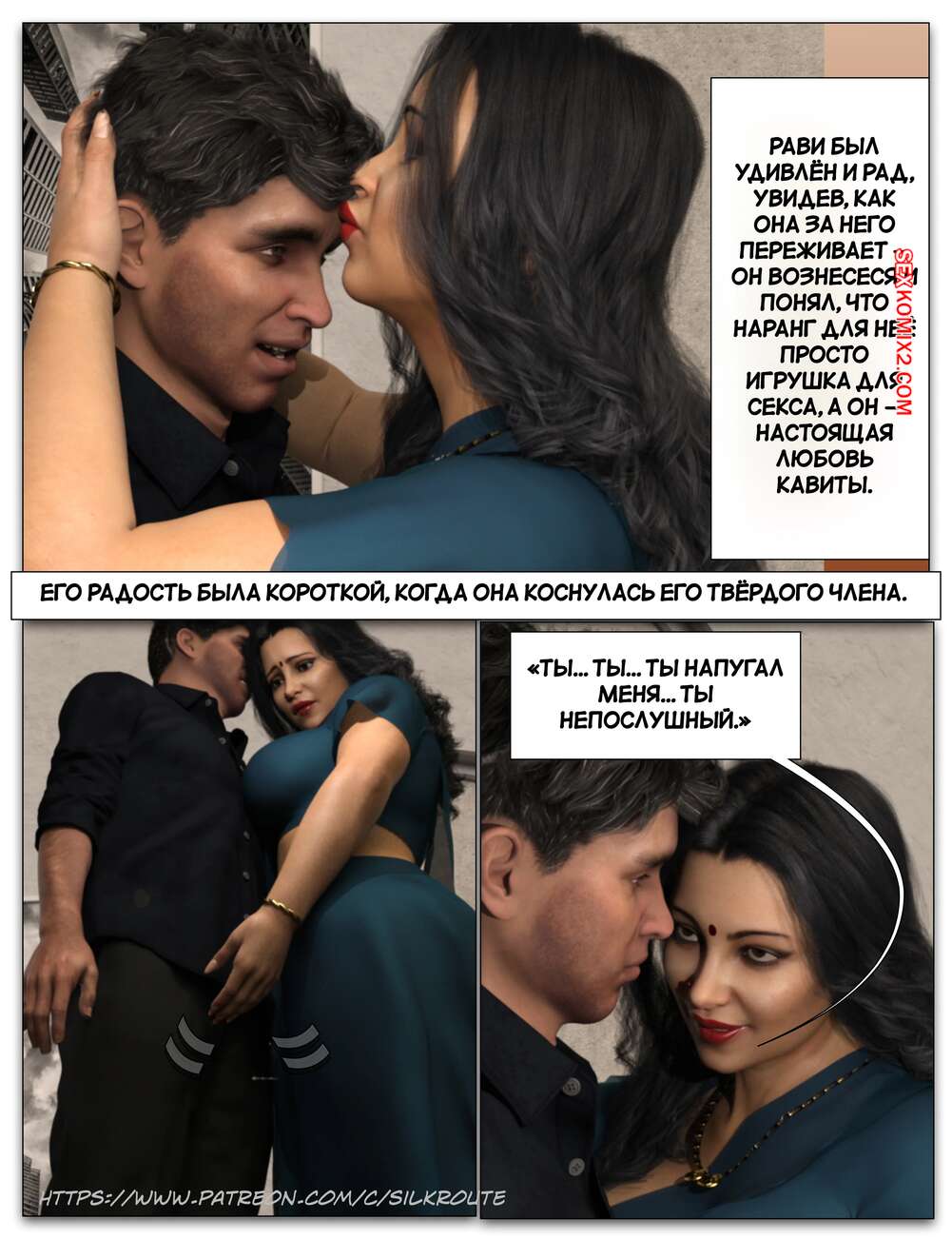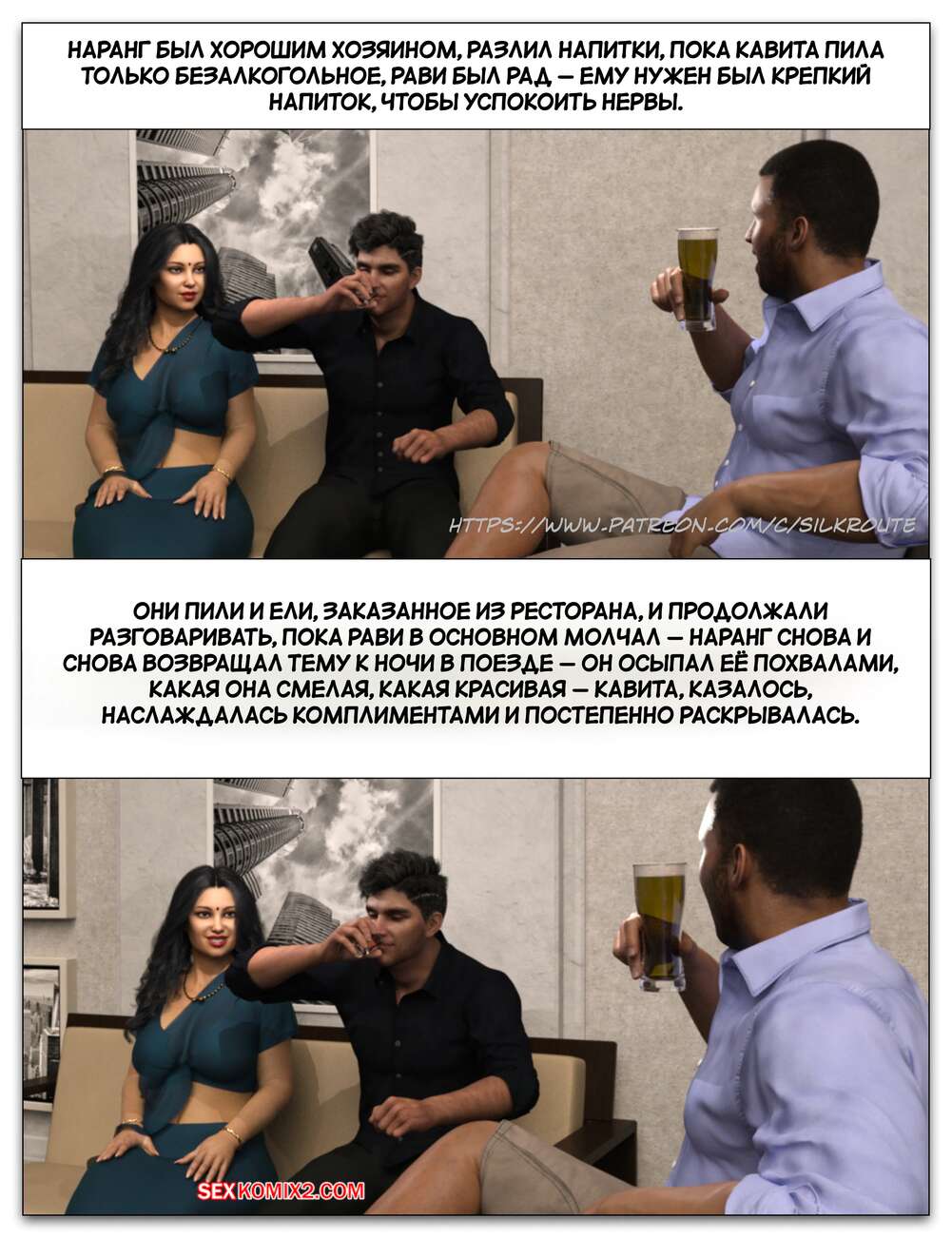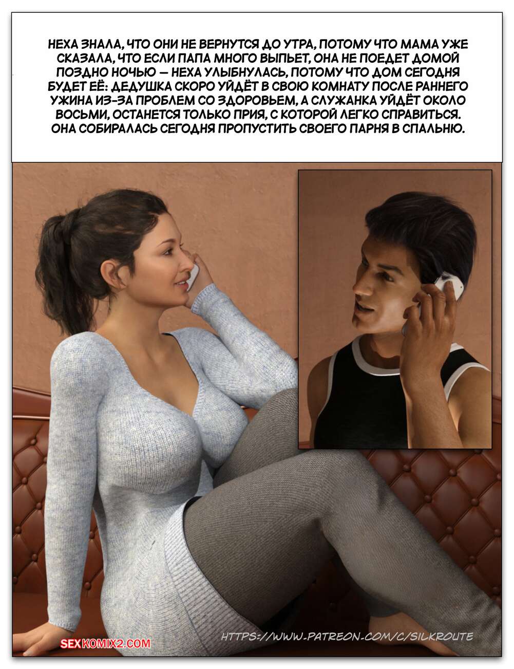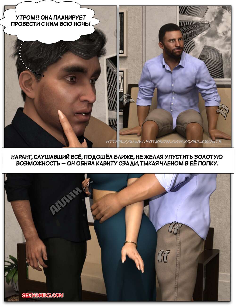 Порно комикс Забрать ее. Часть 3. Take Her. Silk Route Красотка с мужем пригласили к себе домой парня, с которым они ехали вместе. Тот стал целоваться девушку и стянул с нее трусики, после чего взял ее за руку и повел в спальню.