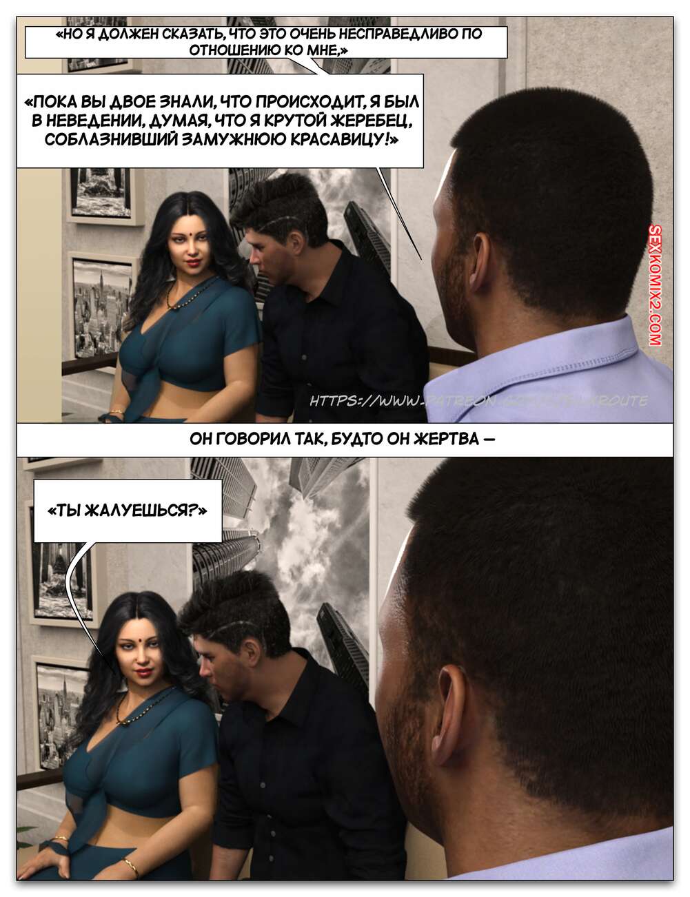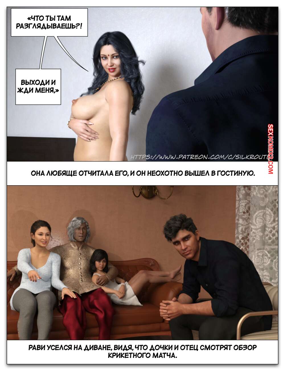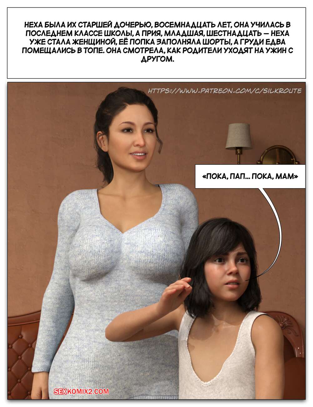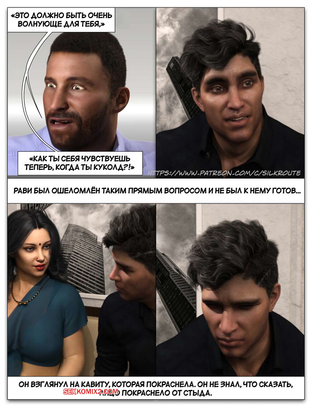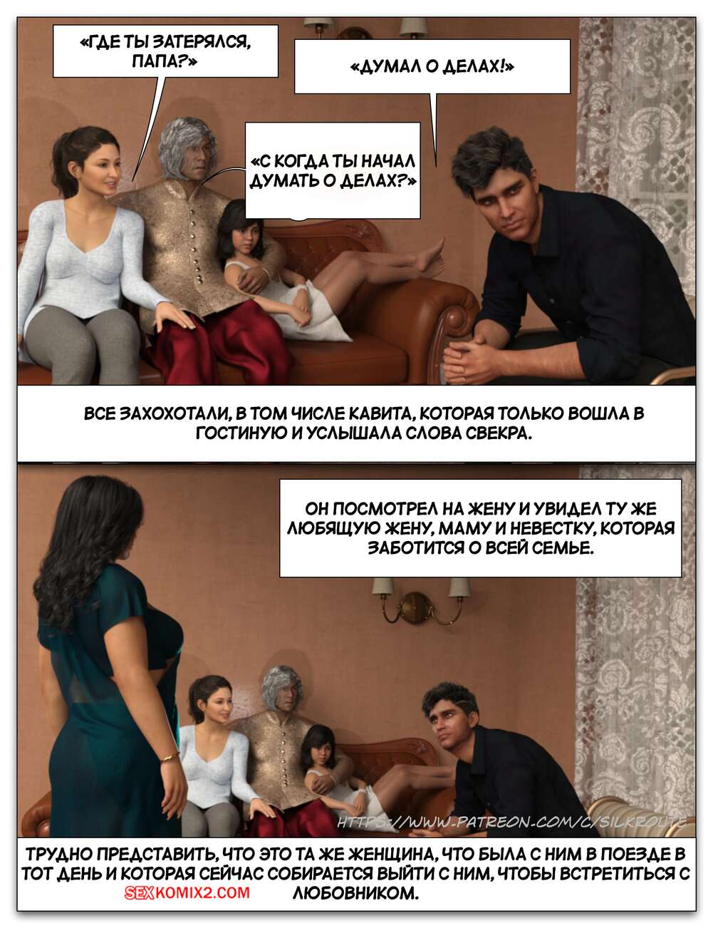 Порно комикс Забрать ее. Часть 3. Take Her. Silk Route Красотка с мужем пригласили к себе домой парня, с которым они ехали вместе. Тот стал целоваться девушку и стянул с нее трусики, после чего взял ее за руку и повел в спальню.