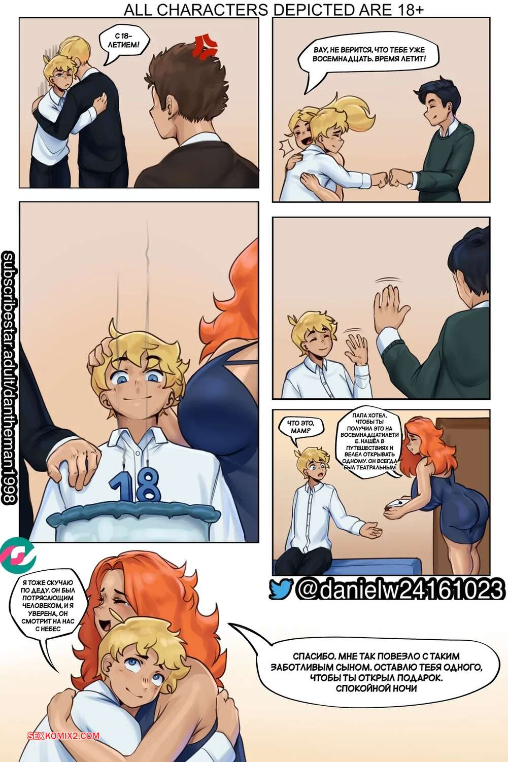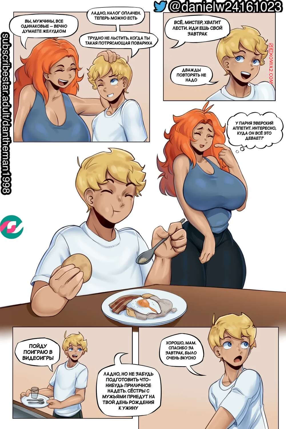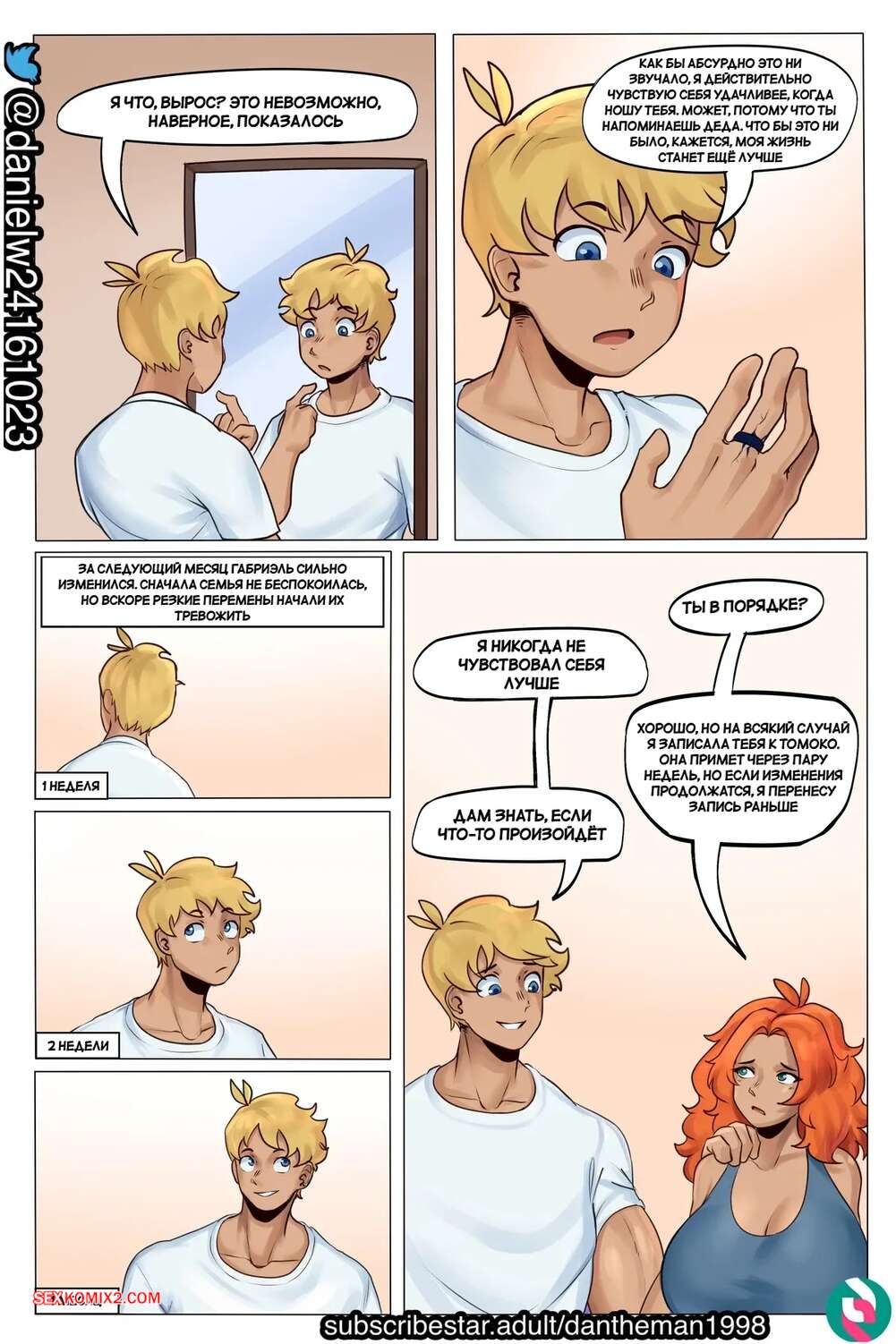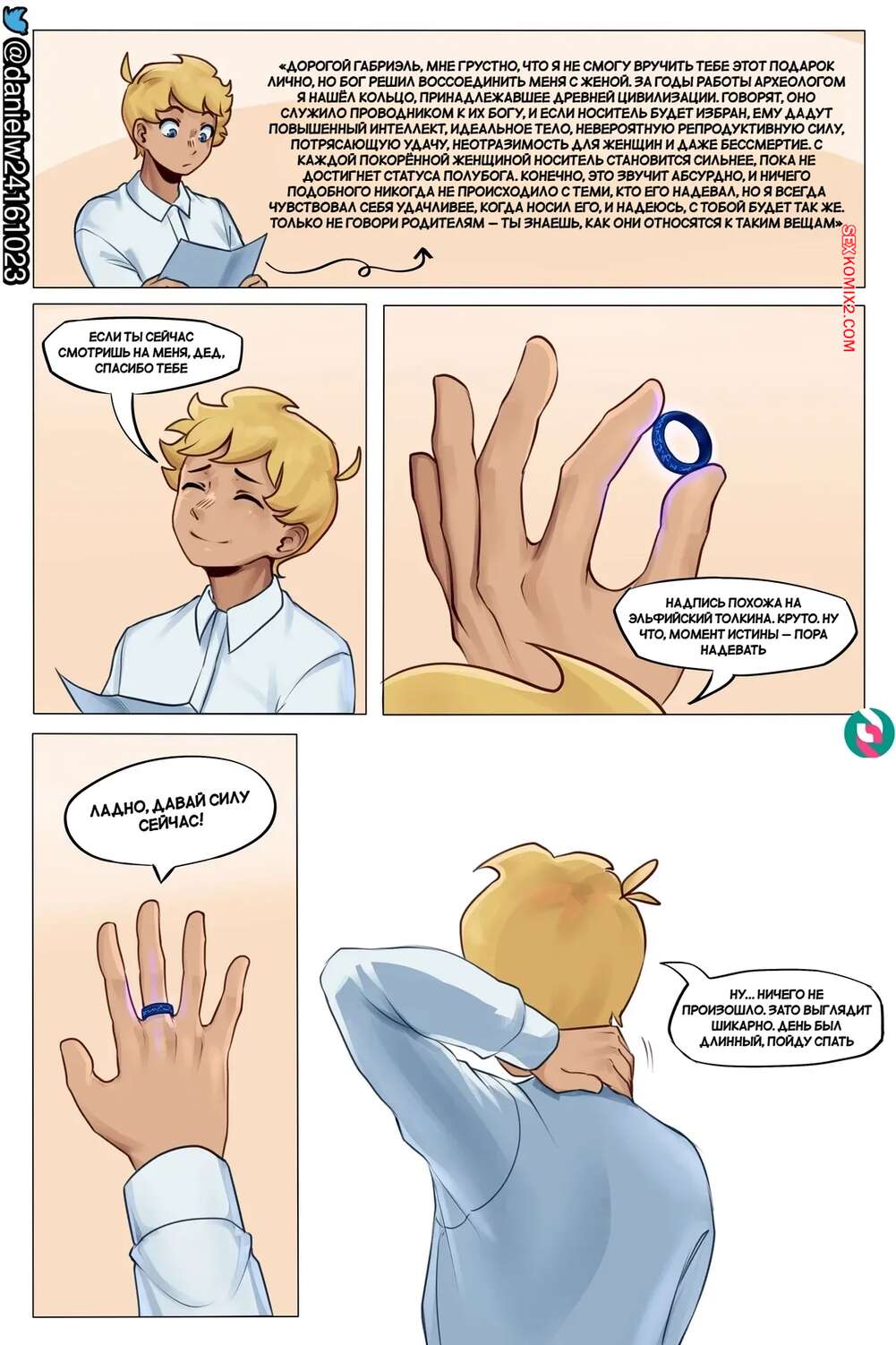 Порно комикс Вознесение эротического бога. Ascension Of An Erotic God. Dantheman. Молодой парень надел волшебное кольцо и проснулся сильно взрослым. У него постоянно стоит член, поэтому его горячая мамочка раздевается и начинает ласкать хуй сына, помогая ему кончить.