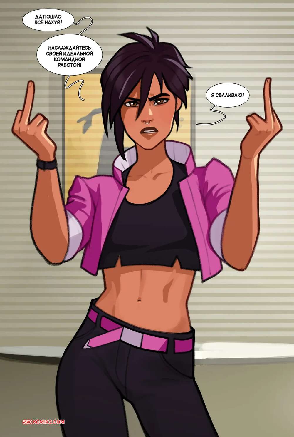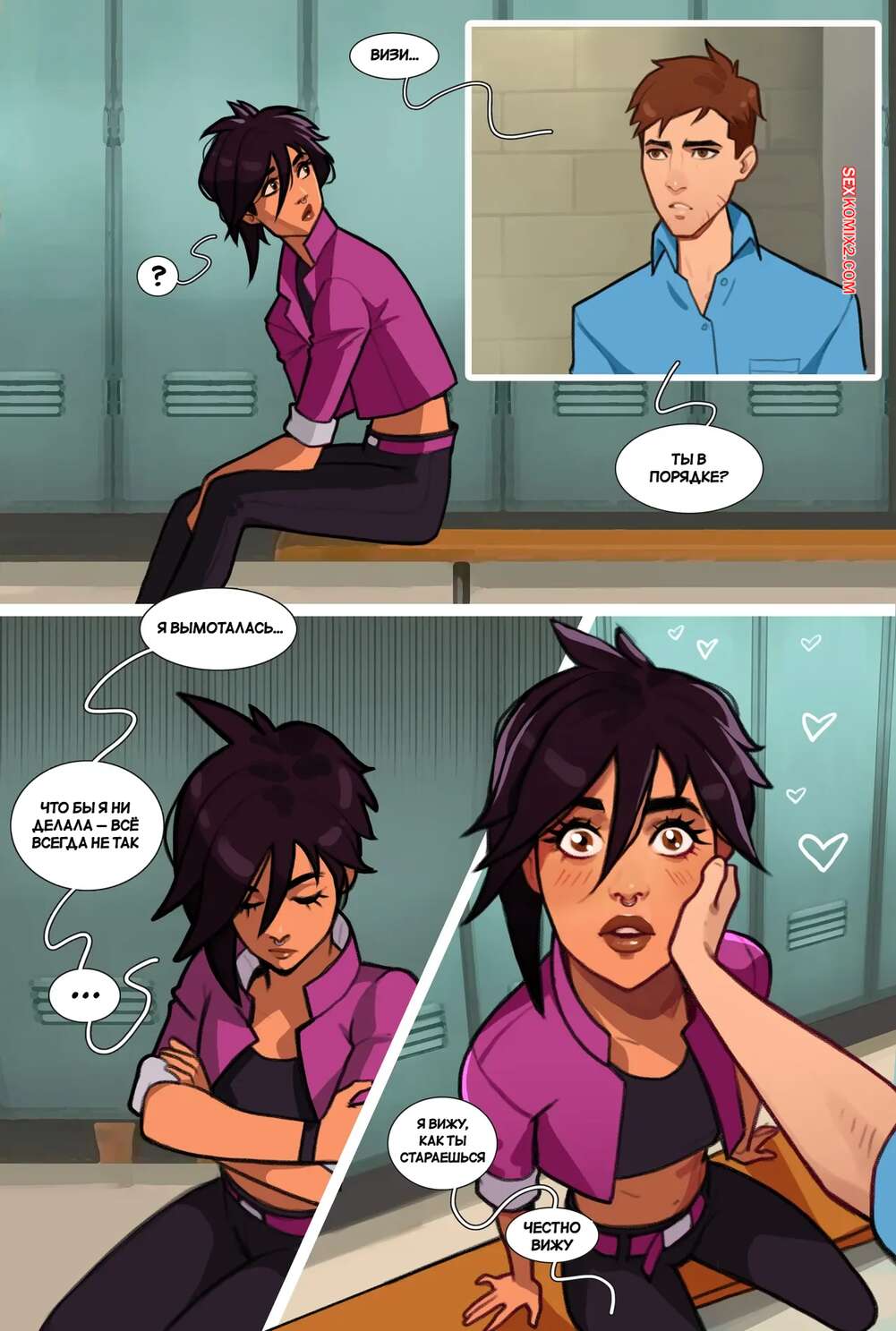 Порно комикс Dispatch. Отправка. olena minko. Горячая брюнетка заигрывает с парнем в раздевалке, желая пошалить. Она разделась и парень стал ласкать ее пизду пальцами, после чего хорошенько ее выебал и заполнил своей спермой.
