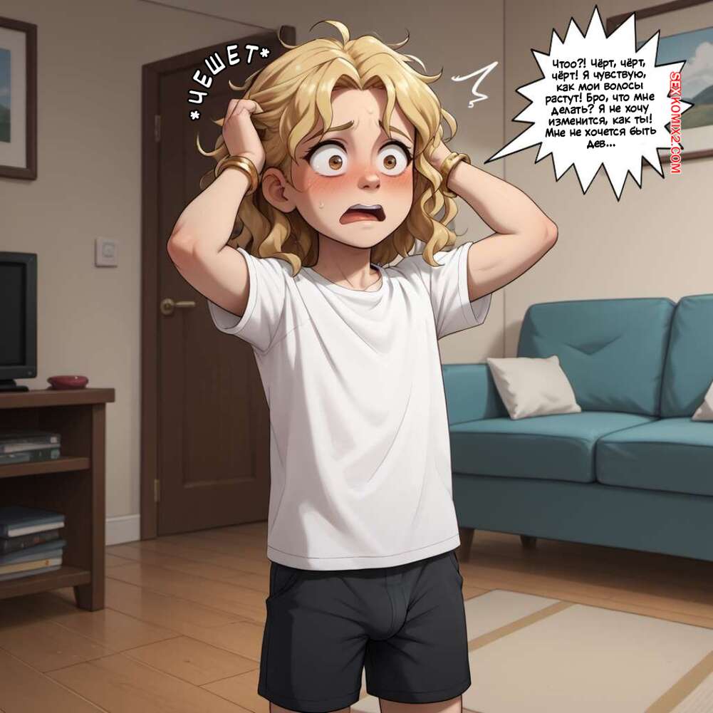 Порно комикс Сумочка изобилия. Часть 1. Purse of Plenty. Alwaysolder Два брата нашли странные артефакты, от чего их тела стали меняться. Один парень превратился в сексуальную блондинку бимбо, а другой в блондиночку ботанку. Обе красотки теперь испытывают сильное возбуждение.