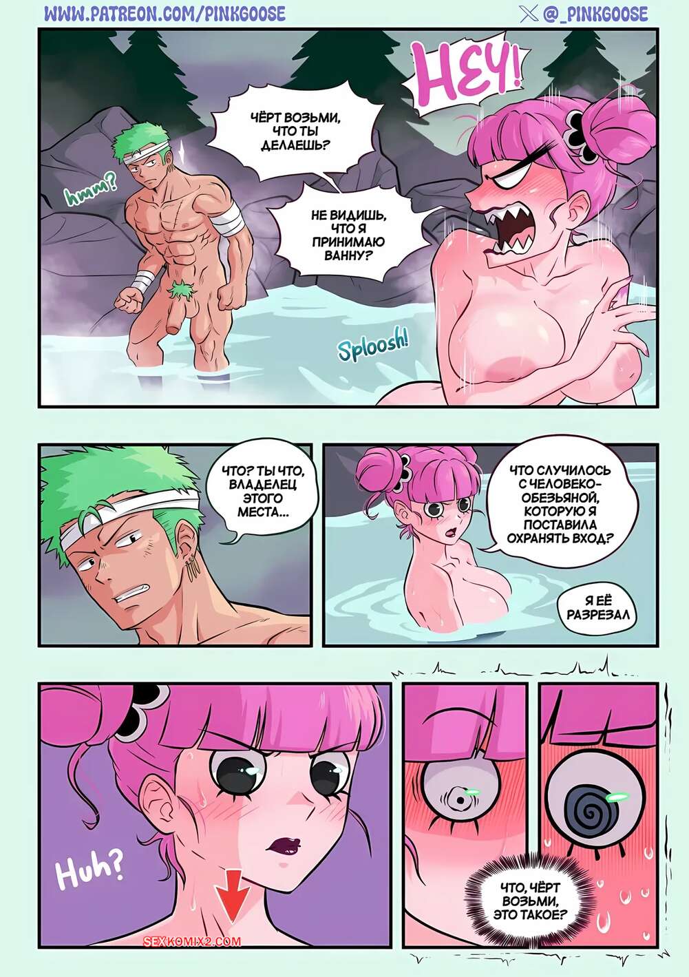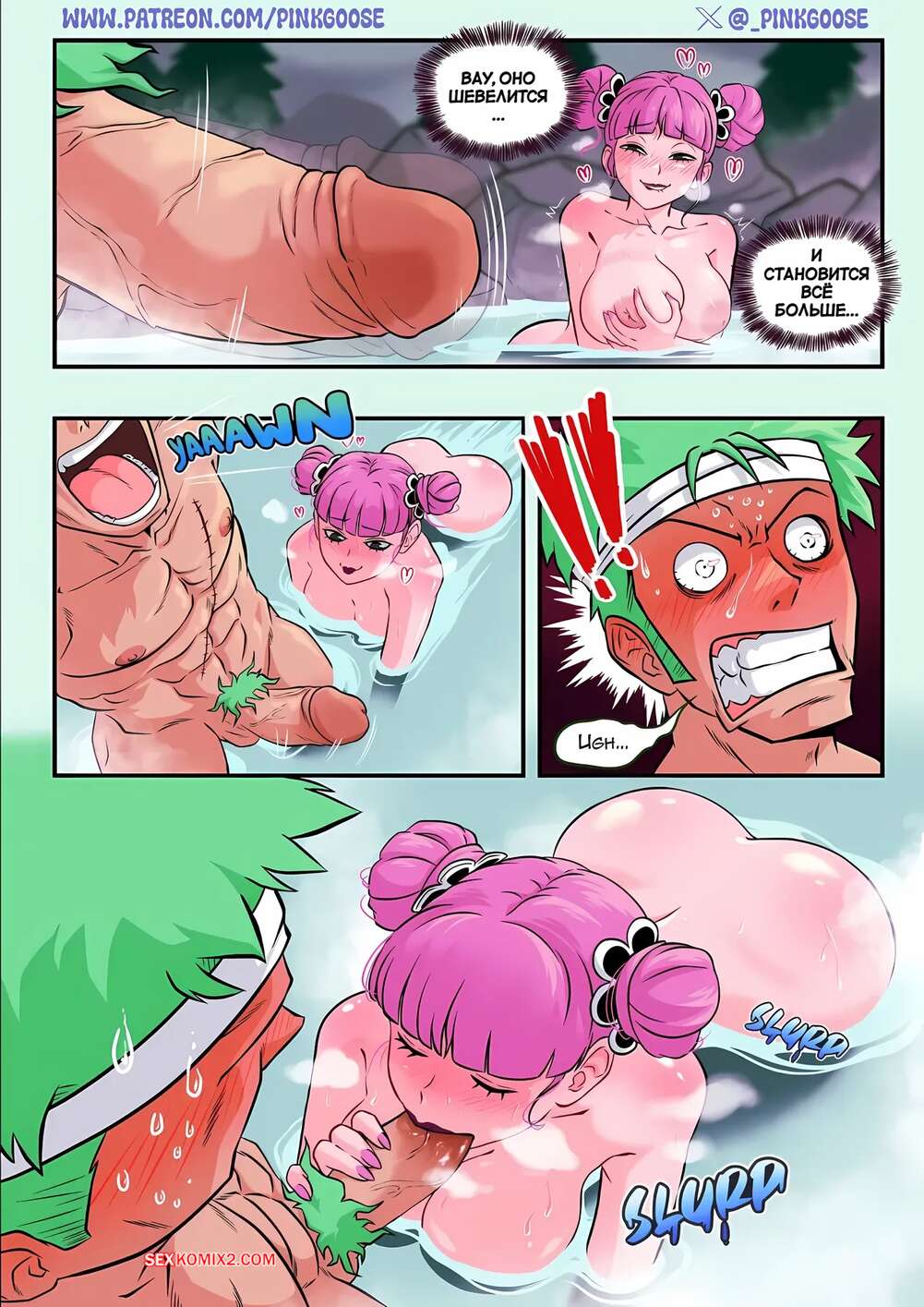 Порно комикс One Piece. Что не так, мечник. Whats wrong Swordsman. Perona x Zoro. PinkGoose Горячая красотка купалась в горячем источнике и увидела у парня стояк, что ее очень возбудило. Девушка стала отсасывает своему дружку, после чего дала выебать свою пизду.